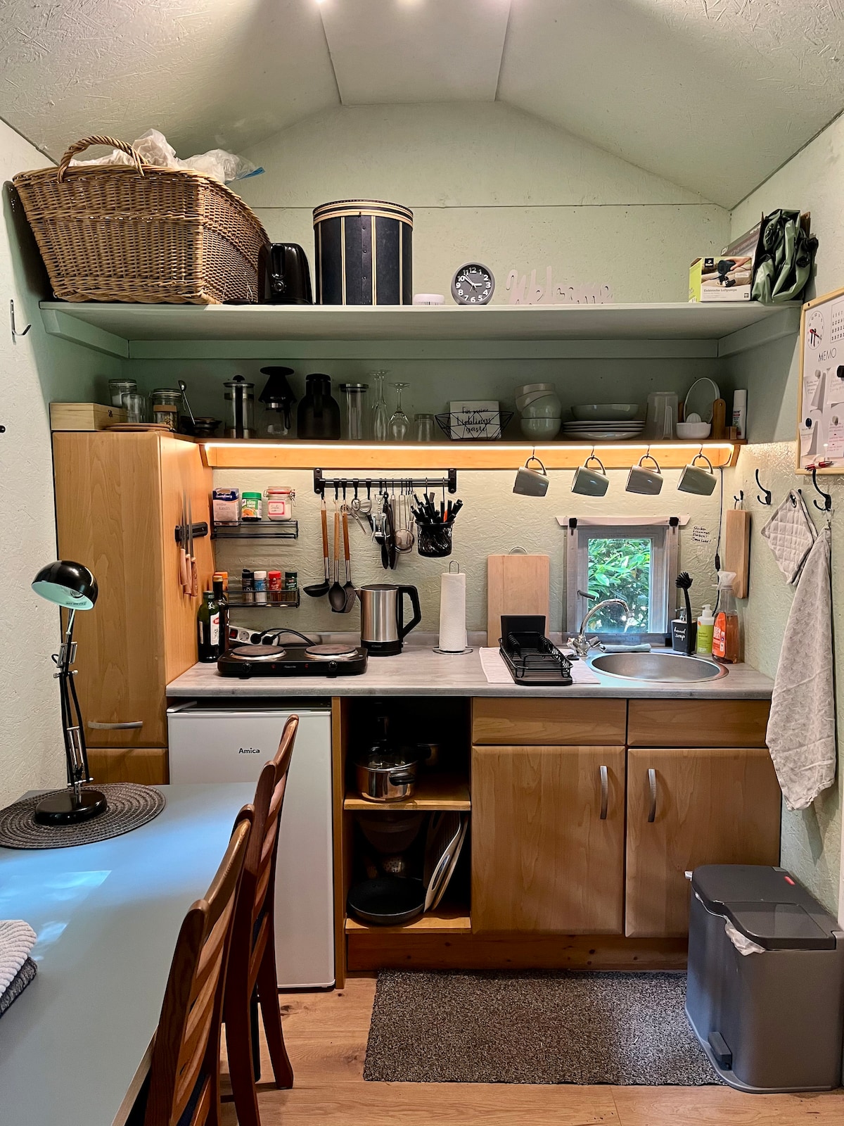 Das 1 Zi. Anliegerapartment liegt zur Hofseite und hat einen eigenen Eingang von einer großen überdachten Terasse . Es ist ein kleines Zimmer mit Bad und Mini Küche. Der Wohnraum ist eher klein. Es gibt aber die große überdachte Terrasse mit Sitzgelegenheit wo geraucht werden kann .