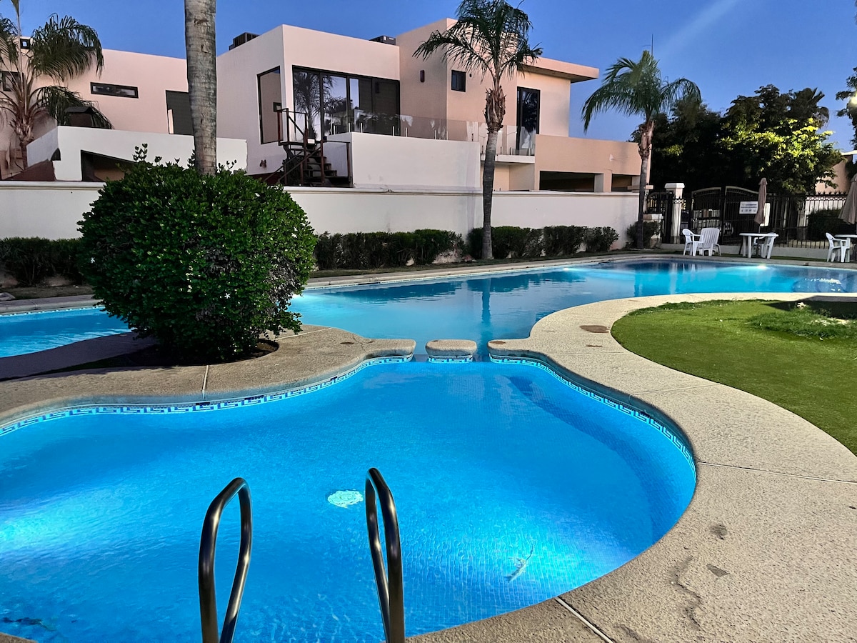 Este alojamiento único cuenta con espacio suficiente para una tranquila estancia en compañía de los tuyos. Pensado para tu comodidad con mucho espacio y complementos para que te sientas como en casa, con internet, tv, sofá cama, una amplia estancia y dos habitaciones. Cercano a lugares de interés como el Consulado Americano, Club de Golf y hospitales. Con supermercado en la parte inferior, cafetería, gasolinera y banco. En una estancia de más de 5 noches se agrega botella de vino de bienvenida !