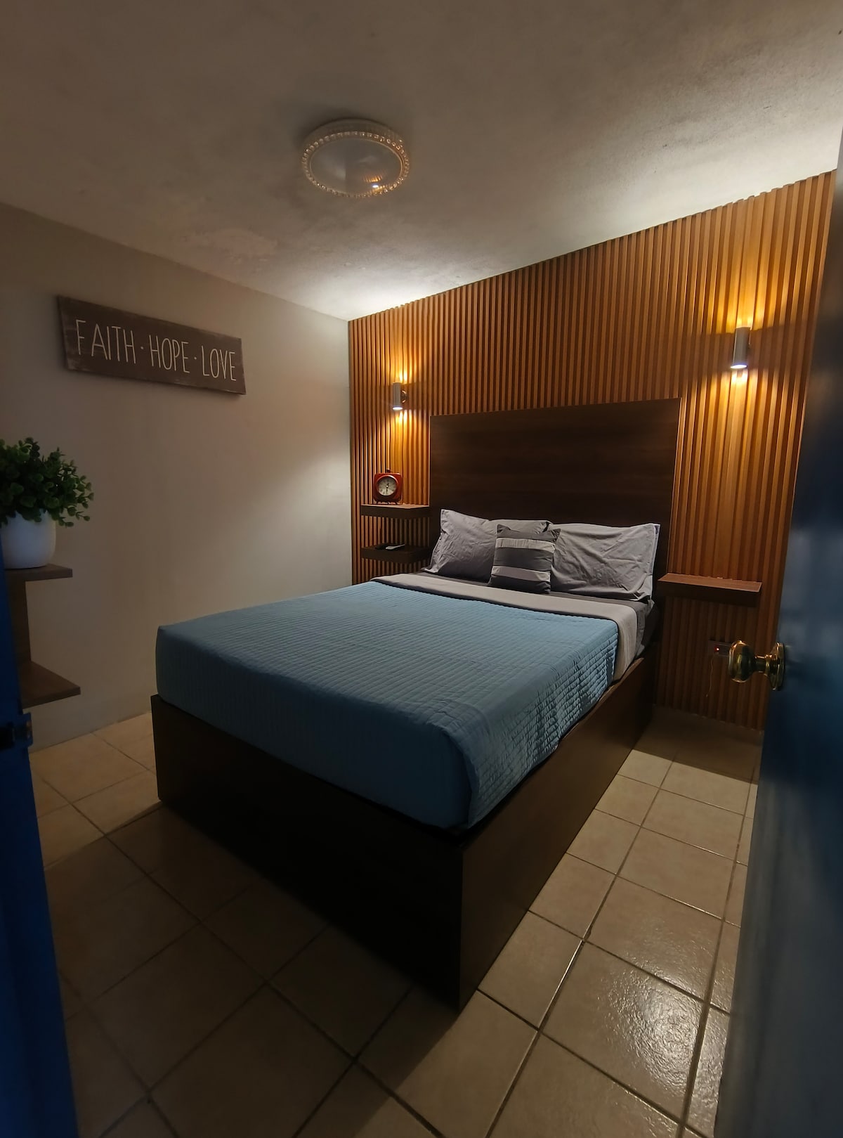 Excelente ubicación, departamento céntrico recién remodelado. Cuenta con cama matrimonial muy cómoda, cocina, internet de 200 megas, smart tv, cocina equipada y baño completo. Ubicación inmejorable! A la esquina de la calle se encuentra un súper donde puede hacer su mandado, a una cuadra se encuentra un deportivo muy bonito para hacer ejercicio y correr, a cuadras de hospitales, farmacias, papelerias y de vías principales! SE FACTURA Déjame saber como te puedo ayudar, me encantará hospedarte.