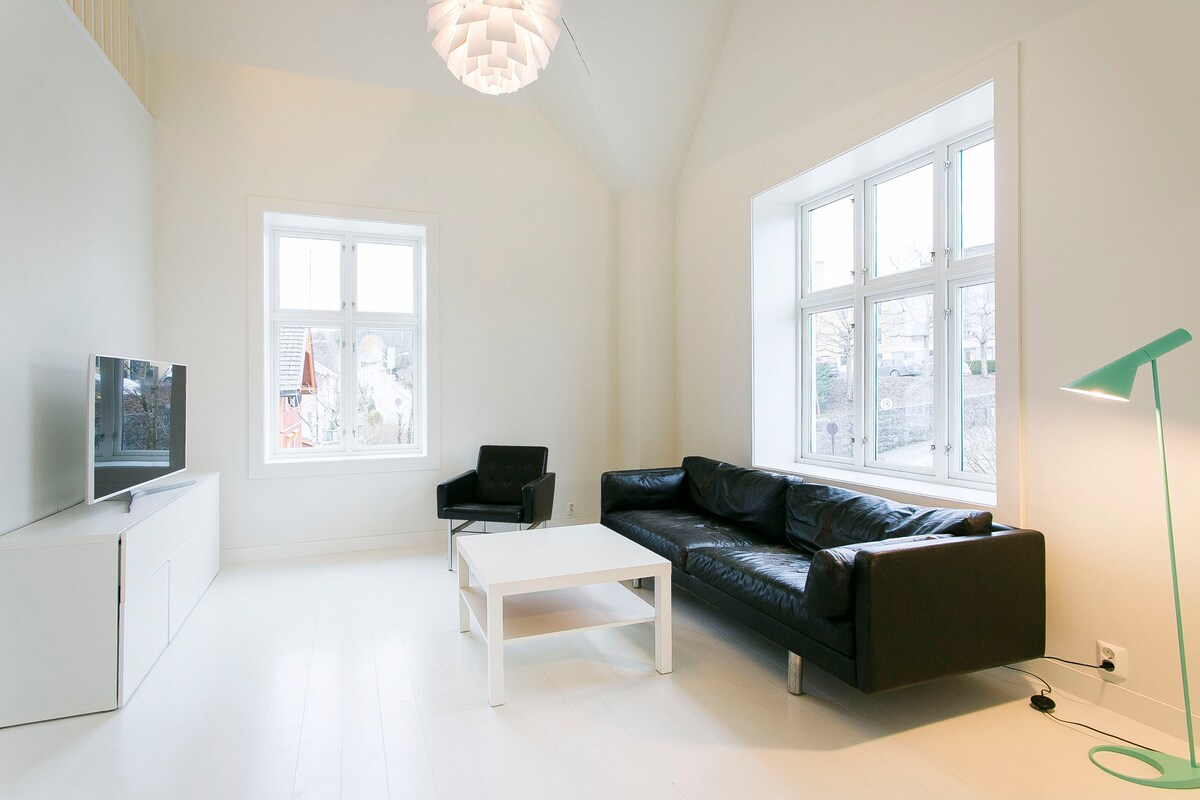 The Penthouse is a very special apartment in the middle of the city center of Porsgrunn. You can walk to everything, train station, cinema, city hall, the river, bars, restaurants etc. The apartment is located on the second and third floor of a charming jugend building from 1910. The apartment has a comfortable balcony with incredible views of what is most likely the only catholic stave church in the world.