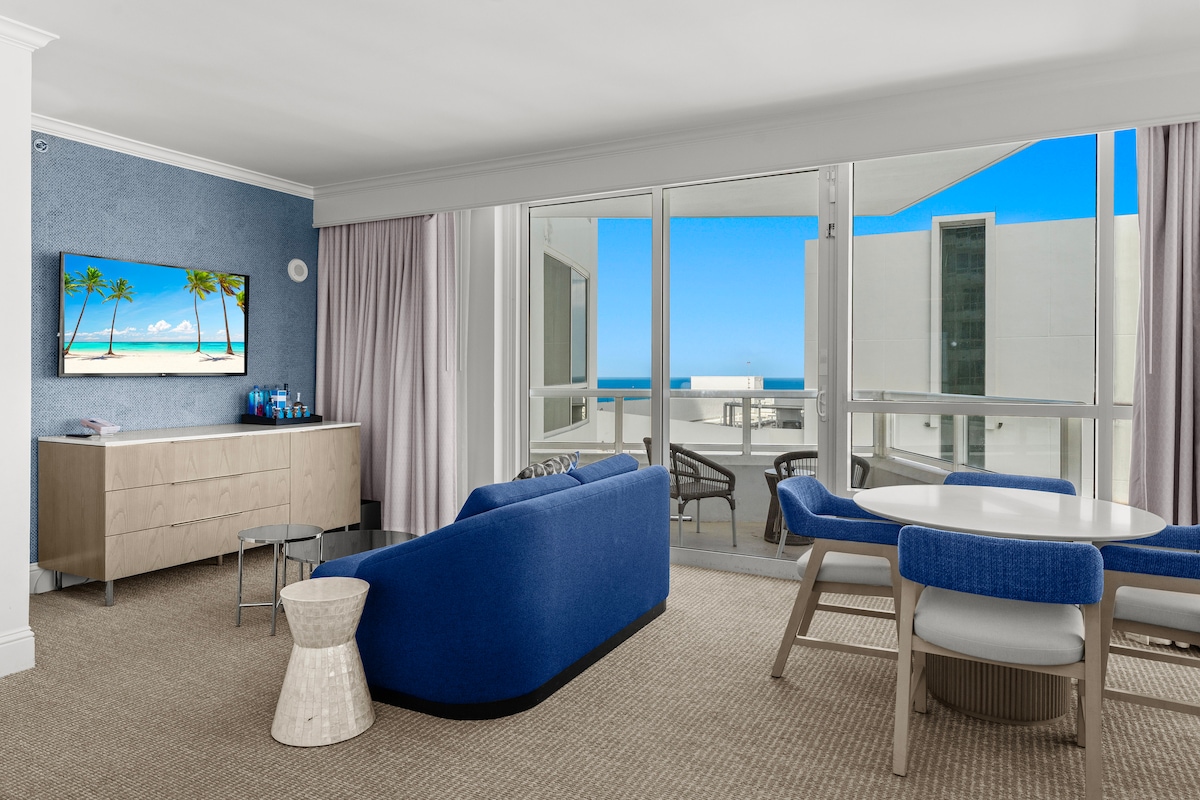 Μεγάλη σουίτα ενός υπνοδωματίου που βρίσκεται στο Fontainebleau Hotel & resort. 93 τ.μ. με ιδιωτικό μπαλκόνι. Ολόκληρο διαμέρισμα με πλήρη κουζίνα και 2 πλήρη μπάνια και μπανιέρα τζακούζι στο κύριο υπνοδωμάτιο. 1 κρεβάτι king size 1 καναπές-κρεβάτι πλήρους μεγέθους 2 δωρεάν πάσο για το σπα Διατίθεται βρεφικό κρεβάτι από το ξενοδοχείο έναντι αμοιβής ΔΕΝ περιλαμβάνεται καθαρισμός. Υπάρχει υποχρεωτικός καθαρισμός 205 $ + φόρος που χρεώνεται κατά την αναχώρηση. Υποχρεωτική εγγύηση 250 $ ανά διανυκτέρευση που ΕΠΙΣΤΡΈΦΕΤΑΙ μετά τη διαμονή σας. ΔΕΝ περιλαμβάνεται στάθμευση. Η ημερήσια χρέωση υπηρεσίας παρκαδόρου ενδέχεται να διαφέρει, δείτε με το ξενοδοχείο