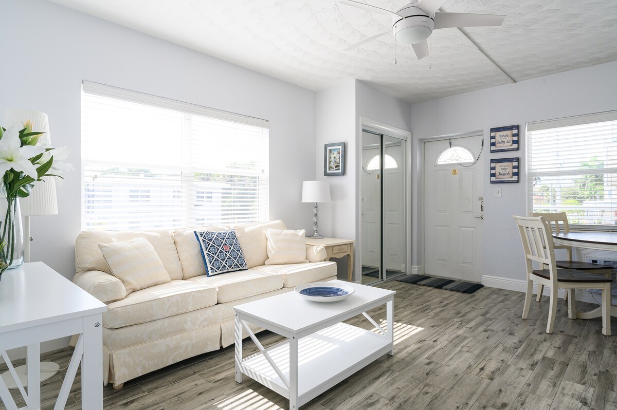 Beautiful 1 bedroom condo located directly on the intracoastal with a heated pool. This unit DOES NOT have water view from the condo BUT has amazing views of the intracoastal waterway from the patio/pool area. Enjoy watching the yachts sail by along with taking in amazing sunsets from the dock. Work from home, 1 block from the beach! Quiet and peaceful. Within walking distance to many shops and local amenities! Perfect for couples, young families and groups of friends traveling together.