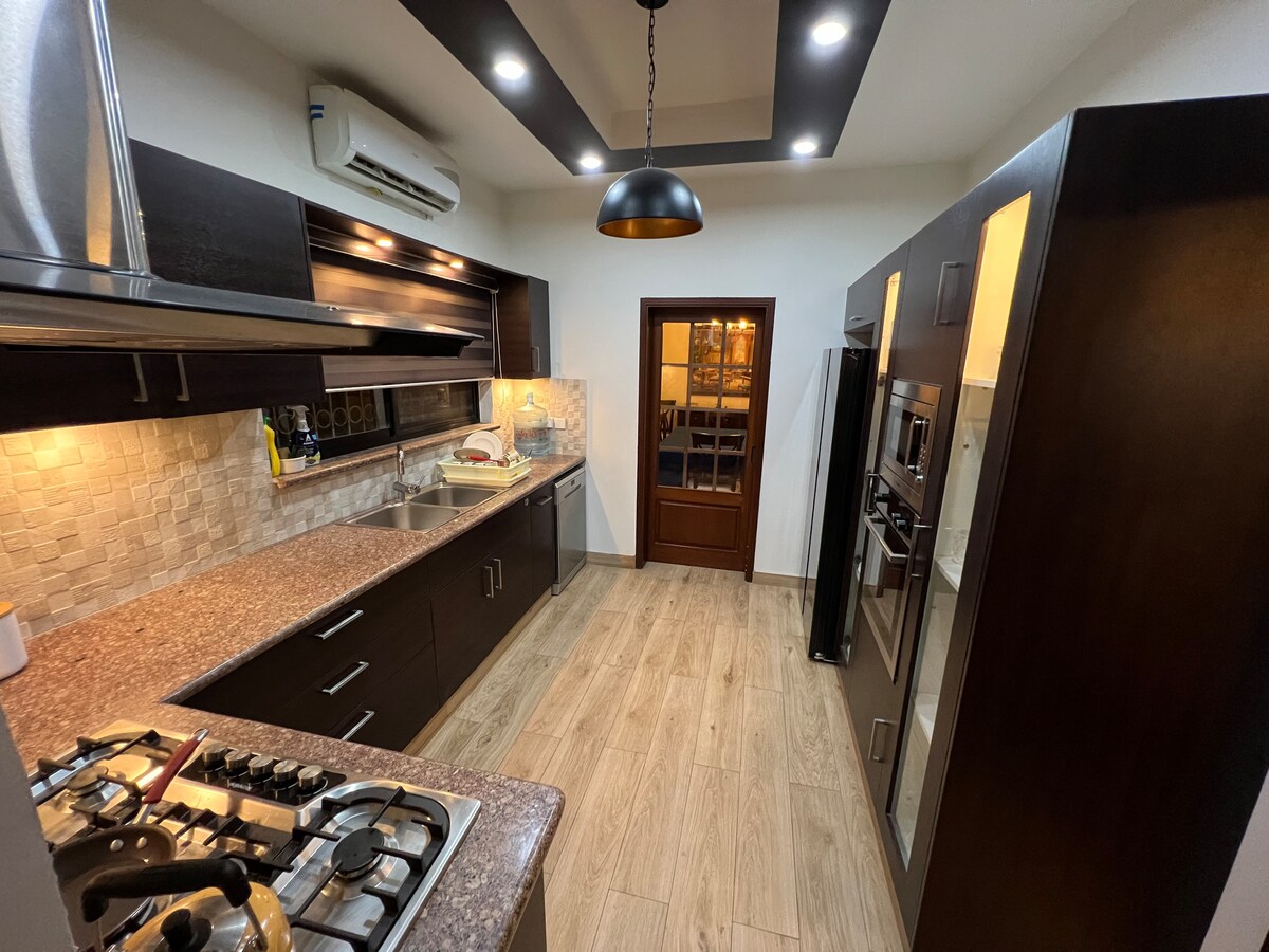Enjoy everything Karachi has to offer while staying in this brand new 7 ⭐️, beautifully decorated,3 bedrooms,8beds, 4 bathroom home.The large space features a lounge, drawing room, patio, rooftop, dining room, 2 kitchens and laundry room. Conveniently located at Phase 6 Bukhari Defence Karachi, just 100 metres from the sea and 50 metres away from Khayabane Bukhari commercial.Dolmen mall 2 km away This house is perfect for all types of travelers who are looking to experience the city of lights