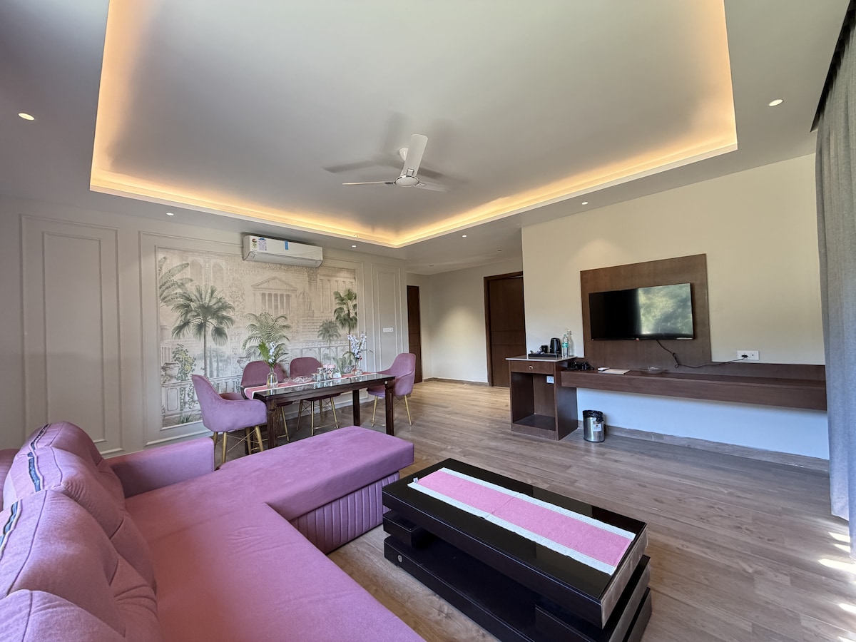 Visit us at Saraiville and stay at this beautiful spacious suite featuring a cozy living room with sofa-cum-bed, TV and a dining area, perfect for families and couples. Step out to your private balcony and enjoy breathtaking river and mountain views. The beautiful bedroom offers scenic views and comes with an attached ensuite washroom. Order fresh, delicious meals from our kitchen anytime. Enjoy garden space, kids play area, swimming pool and multiple activities. 24x7 hot water + hot/cold AC.