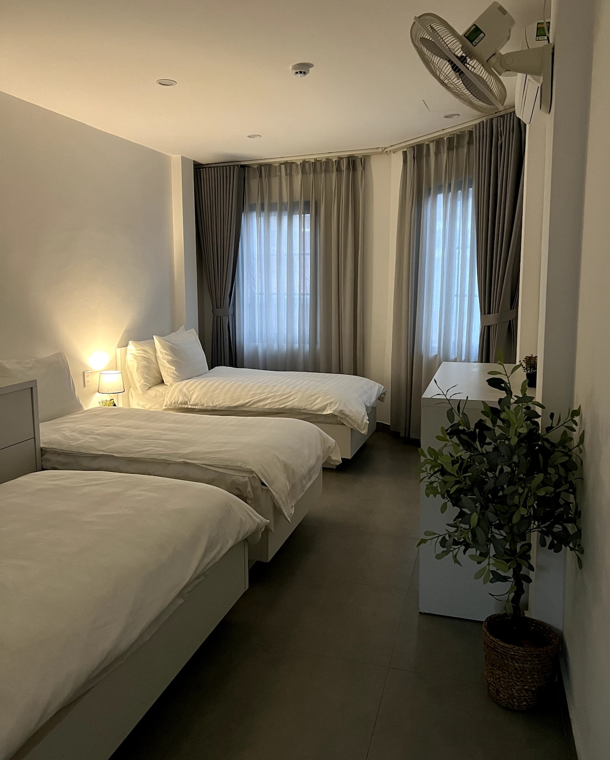 Βρίσκεται σε μια ζωντανή γειτονιά στην καρδιά της πόλης (5 λεπτά με τα πόδια από την Όπερα και τον σιδηροδρομικό σταθμό Hai Phong). Το δωμάτιο βρίσκεται στον 4ο όροφο, 22 τ.μ. είναι κομψά σχεδιασμένο, άνετο, χαλαρωτικό με πολύ ωραία μεγάλα παράθυρα, ευρύχωρα ντουλάπια αποθήκευσης. Παρέχουμε κλιματιστικό ψύξης, 3 άνετα μονά κρεβάτια με μαξιλάρια και παροχές στο μπάνιο. Σκάλες στο όμορφα σχεδιασμένο δωμάτιο.
