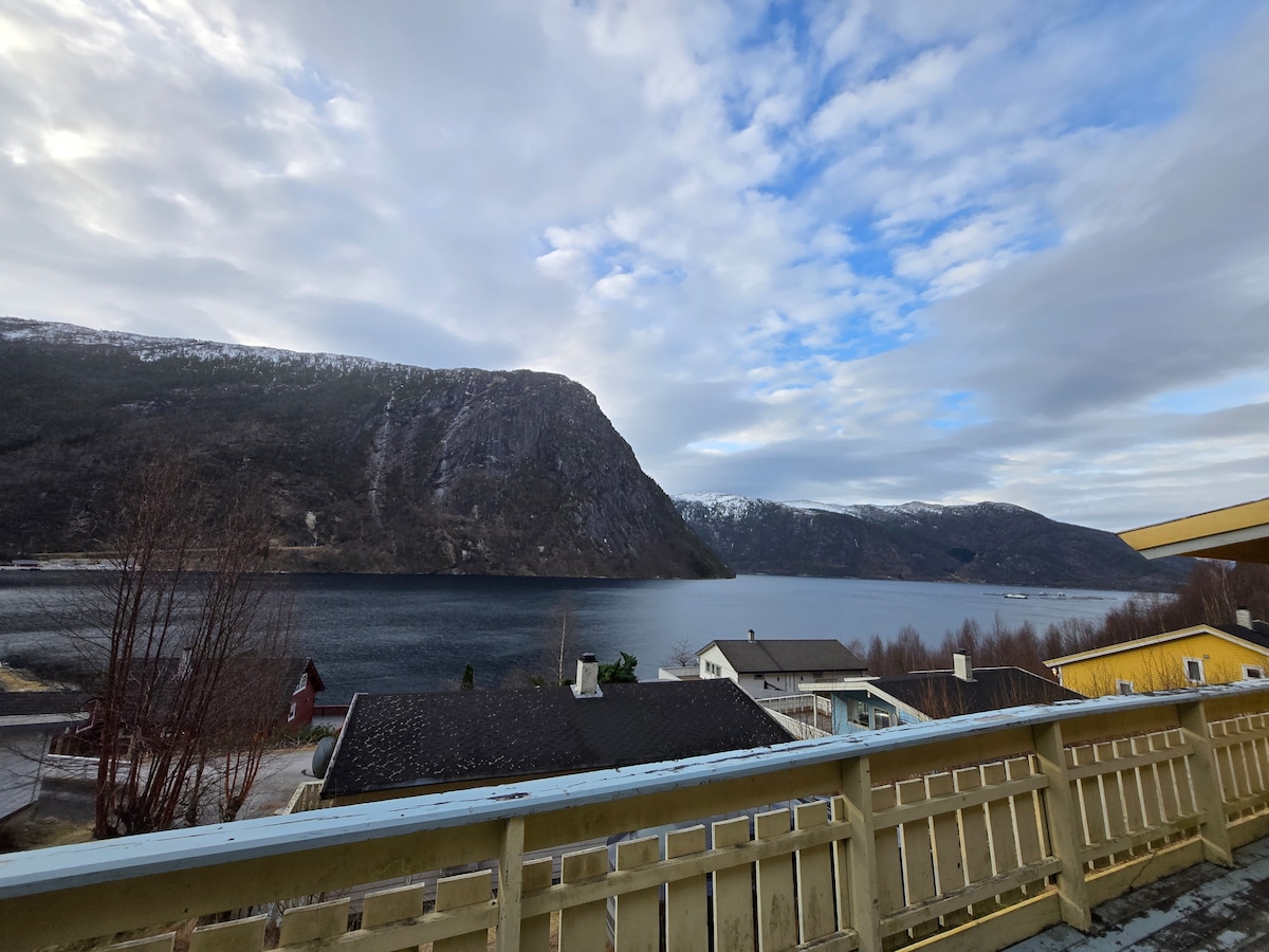 Del av enebolig med fjordutsikt. 100 meter fra badestrand. Egen flytebrygge for fisking og bading. Badestige er montert. Badestrand i nærhet. Mulighet for å leie båt etter nærmere avtale. Boligen har stue, kjøkken, bad og 2 soverom. Stor terrasse med gode solforhold og utsikt mot Sognefjorden. Tilgang til natur og stier. 5 minutter til dagligvarebutikk. (Utleieenhet i kjelleren på boligen med en leieboer). Sengetøy og håndklær kan leies,270kr pr pers. Mulighet for å lade elbil(150kr)