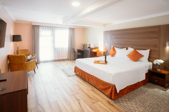 Our one-bedroom at Mashpark Hotel offers a comfortable and stylish space with a private bedroom, cozy living area, and a fully equipped kitchenette. Guests enjoy modern amenities including Wi-Fi and access to on-site facilities such as a swimming pool and gym, all in a convenient and secure location.