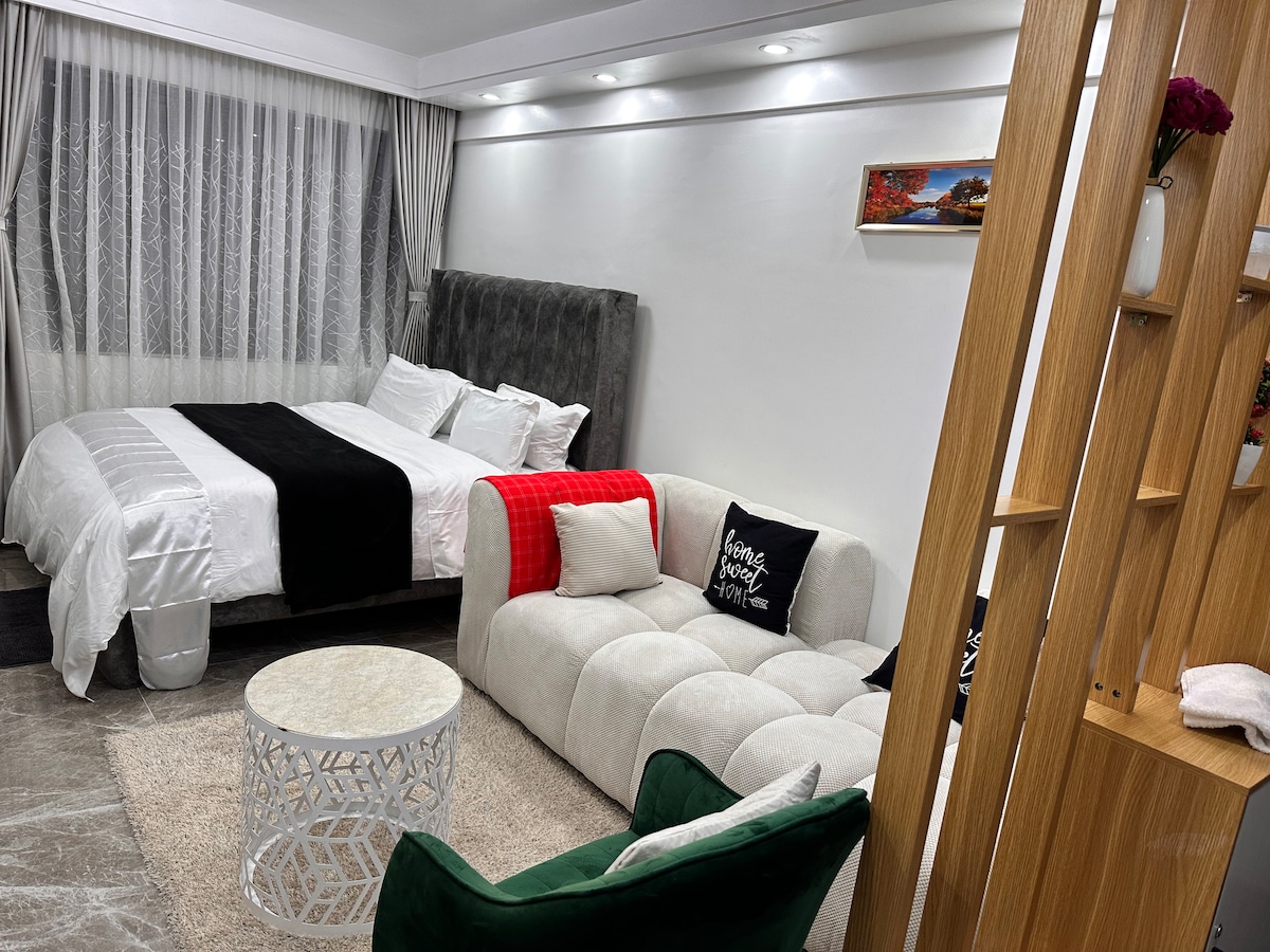 Welcome to your cozy home away from home! This modern Studio apt is located in the Heart of Kilimani offering a perfect blend of comfort for both short/ long stays with Blackout curtain’s for easy Daytime Sleep. The studio is furnished with modern furnitures and is equipped with all amenities you need for your stay. The apt offers a peaceful & private environment and it accommodates 2 pax max. The property is Fumigated to ensure it’s Mosquito free There is so much to engage around.