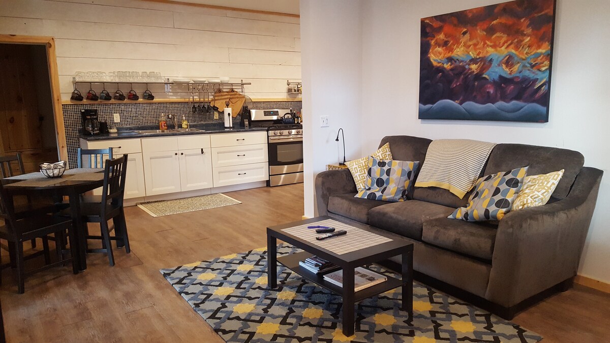The ideal home base for outdoor exploration, right in Keene, center of the High Peaks. With unrivalled proximity to the mountains, local dining and shops are just a walk away. This 1BR/1BA space with full kitchen blends rustic Adirondack exteriors with renovated contemporary interiors and has everything you need for any length of stay. Experience our designer woodfired traditional Finnish sauna & totally recharge while embracing our harsh Adirondack weather. We hope you love it here.