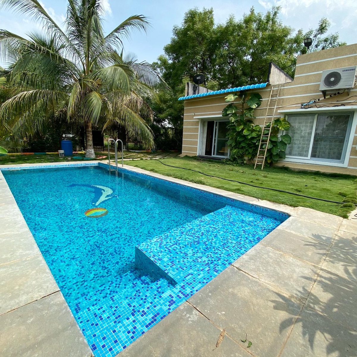 2 στρέμματα όμορφης βιολογικής φάρμας και αυτό το πολυτελές και άνετο ξύλινο σπίτι με ιδιωτική πισίνα και εκπληκτική τέλεια θέα στο ποτάμι κάνει τη διαμονή σας εξαιρετικά αξέχαστη. Το πολύ άνετο πολυτελές υπέρδιπλο κρεβάτι, το τεράστιο μπαλκόνι με ιδιωτική πισίνα κάνει τη διαμονή σας πραγματικά αξέχαστη. Από τη μία πλευρά έχετε θέα στο ποτάμι, η άλλη πλευρά έχει θέα στο γκαζόν. Όταν πρόκειται για δραστηριότητες, παίξτε μπάντμιντον ξυπόλυτος, κάντε μια βουτιά στην πισίνα γλυκού νερού ή απλά κάντε μπάνιο στον ποταμό Saradha, το κρίκετ και το ψάρεμα.