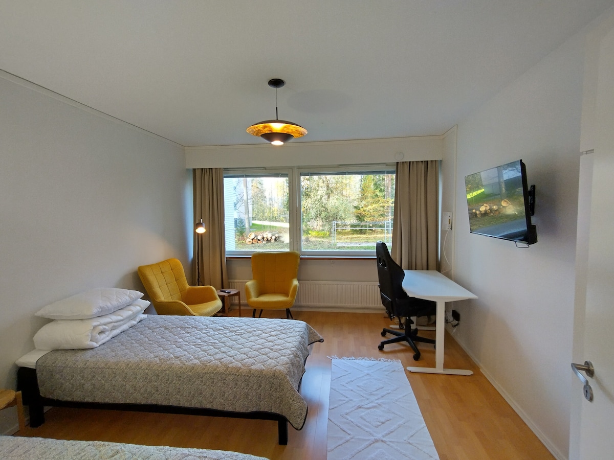 Ελάτε να απολαύσετε ένα ειδυλλιακό σπίτι της δεκαετίας του '50 στο κέντρο της πόλης. Θα μείνετε στον 1ο όροφο μιας πολυκατοικίας χωρίς ασανσέρ (περίπου 8 σκαλοπάτια ανά όροφο). Υπάρχει ιδιωτικός χώρος στάθμευσης με θερμαντικό στύλο και ευρύχωρο διαμέρισμα άνω των 50 τετραγωνικών μέτρων. Μπορείτε να μετακινηθείτε εύκολα στο κέντρο με τα πόδια (15 λεπτά) ή με ηλεκτρικό πατίνι (5 λεπτά). Κοντά θα βρείτε παντοπωλεία, στάση λεωφορείου (100 μέτρα) και δασική περιοχή για τρέξιμο. Η όμορφη περιοχή του λιμανιού του Λάχτι είναι σε απόσταση αναπνοής.