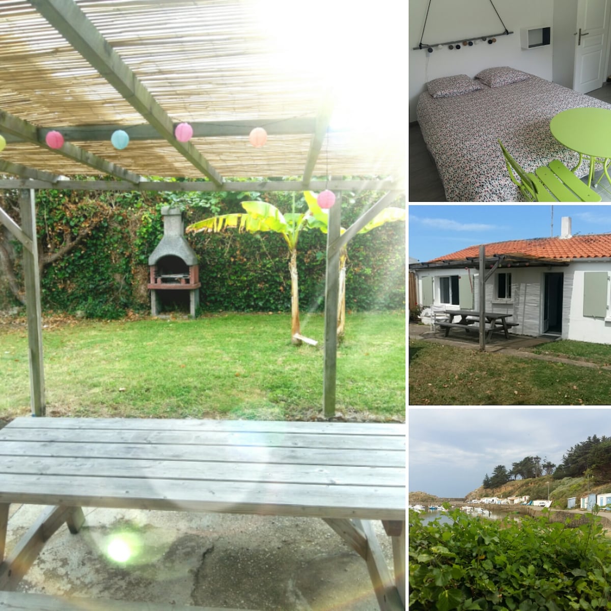 Loue maison PLEIN SUD pour 2 pers sur l'Ile d'Yeu juillet / Aout : DU LUNDI AU LUNDI - séjour T.V., coin cuisine: four, senséo ( prévoir ) micro ondes, frigo, pas de congélateur - salle d’eau avec wc, lave linge - 1 serviette toilette/personne - 1 chambre avec un lit de 2 personnes DRAPS FOURNIS - terrasse et jardin privée clos de mur exposée plein Sud - barbecue, salon de jardin, parasol, transats - matériel bébé - boîte à clefs (en cas d absence)
