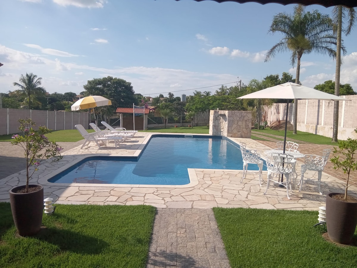 Chácara murada em condomínio fechado, com segurança 24h. Casa térrea com piscina, churrasqueira, wi-fi, varanda e amplo gramado, em ambiente tranquilo, cercado por verde. Avaliação 5 estrelas em limpeza por todos os hóspedes. Perfeito para dias em família e descanso, com conforto e privacidade. O condomínio conta com lago ornamental e playground em sua sede social.