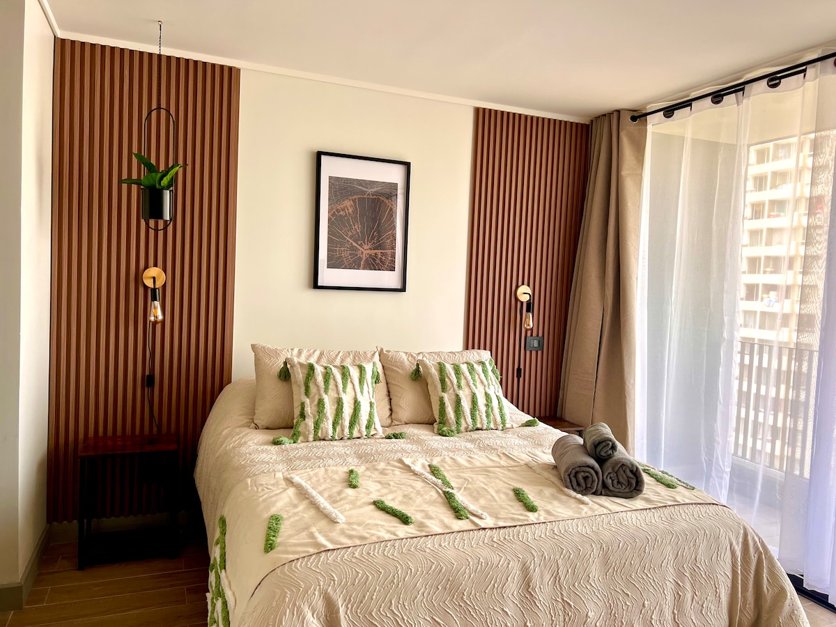 Departamento moderno y funcional de 1 dormitorio con terraza. Full eléctrico y completamente equipado para estadías cortas o prolongadas. Ideal para 2 personas (capacidad hasta 3 con futón). Cuenta con estacionamiento gratuito para nuestros huéspedes, ideal si vienes en auto. Excelente opción para pacientes, acompañantes o profesionales que necesiten alojar cerca de hospitales y clínicas.