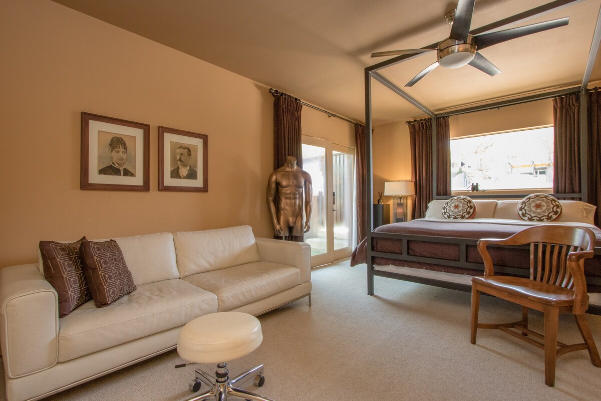Δήμος του Cathedral City Αριθμός άδειας STVR 015862. Καθαρό και απομονωμένο ιδιωτικό άνετο καταφύγιο με ξεχωριστή είσοδο, υπνοδωμάτιο και μπάνιο. Βρίσκεται μέσα στην υπέροχη και ασφαλή γειτονιά Caliente Sands. Διπλό κρεβάτι, τηλεόραση με δωρεάν ταινίες Roku, τραπέζι, γραφείο, WIFI, ανεμιστήρας, μίνι ψυγείο/καταψύκτη, φούρνος μικροκυμάτων, πύργοι USB, καφετιέρα Keurig και καθίσματα εξωτερικού χώρου στην ιδιωτική σας αυλή με σιντριβάνι τοίχου. Στάθμευση κοντά στην είσοδό σας. Δίπλα στο Παλμ Σπρινγκς, κοντά στο κέντρο του Παλμ Σπρινγκς και το αεροδρόμιο. LGBTQ+ Πάντα ευπρόσδεκτοι.