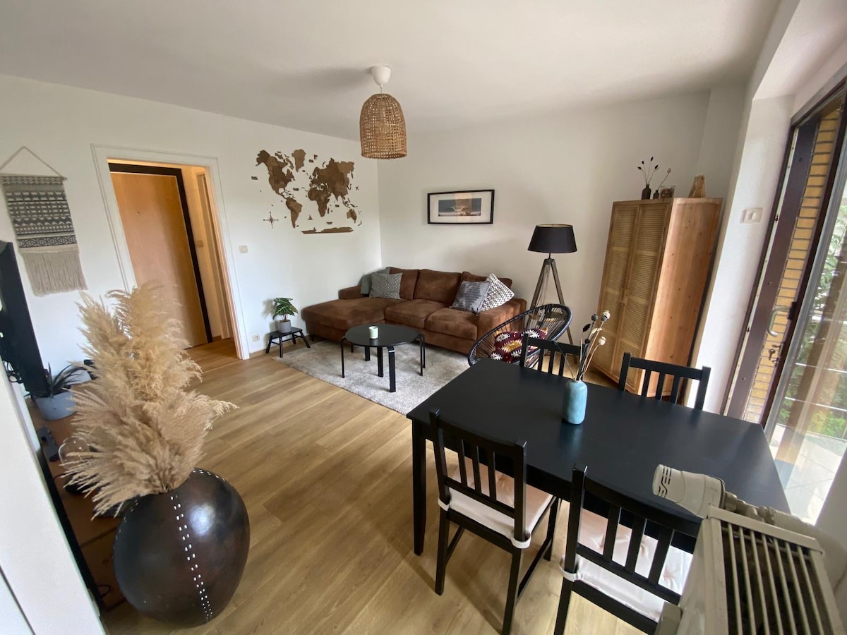 Καλημέρα! Αυτό το φωτεινό κατάλυμα (περίπου 55 τ.μ.) αποτελείται από ένα υπνοδωμάτιο με ένα διπλό κρεβάτι (ή δύο μονά κρεβάτια), ένα μπάνιο και ένα σαλόνι με εξοπλισμένη κουζίνα. Η γειτονιά είναι ήσυχη και βρίσκεται 20 λεπτά από το κέντρο της πόλης με απευθείας συγκοινωνία. Κοντά υπάρχει ένα σούπερ μάρκετ (150μ.), ένα πάρκο, καταστήματα και ένας σιδηροδρομικός σταθμός. Ανυπομονούμε να σας γνωρίσουμε!