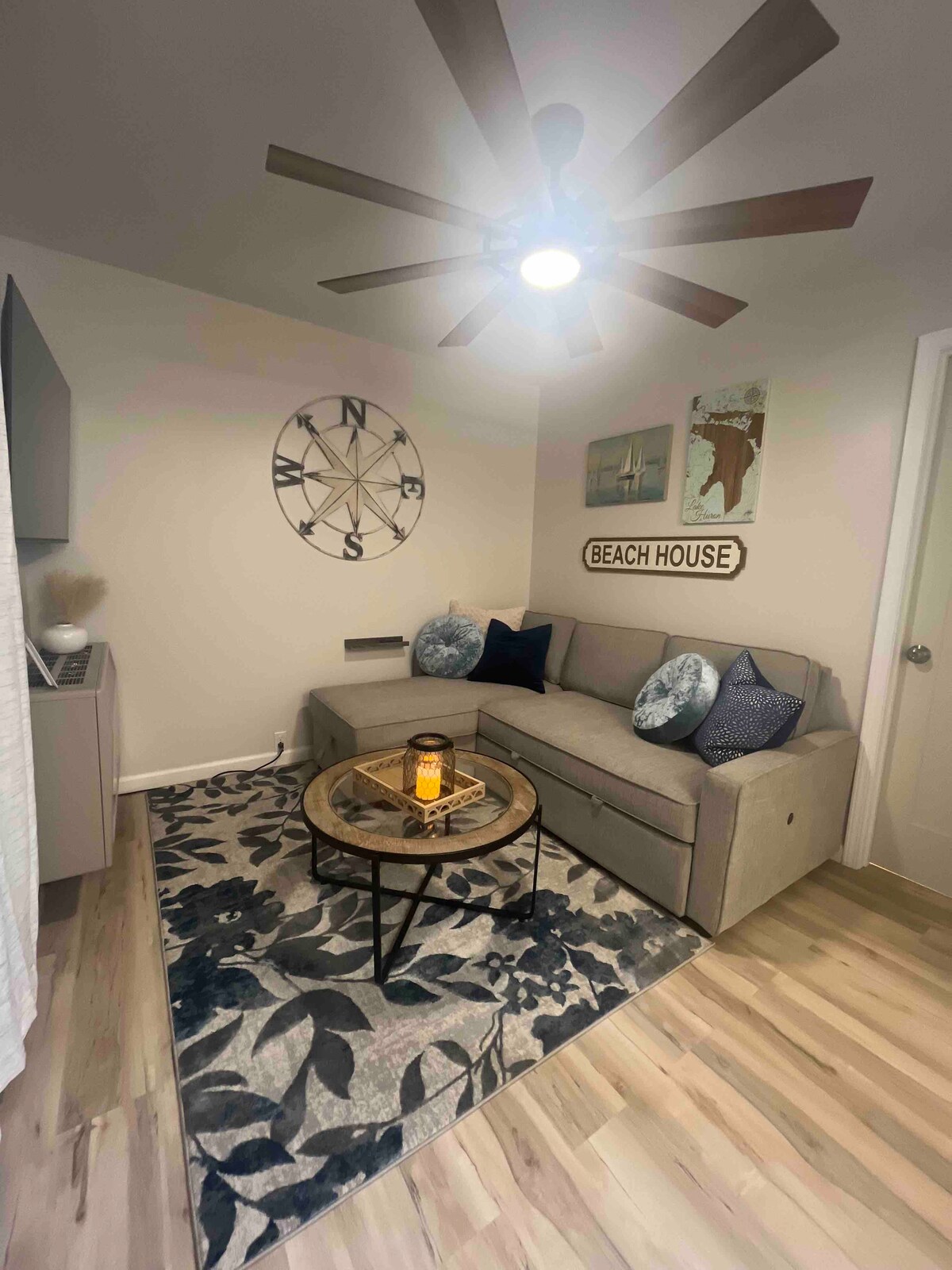 Αυτή η προσφορά είναι μια σουίτα επισκεπτών δύο επιπέδων 950 τετραγωνικών ποδιών με ιδιωτική πρόσβαση στην παραλία στη λίμνη Χούρον χρησιμοποιώντας ένα θέμα κάμπινγκ με χάρτινα πιάτα, πλαστικά μαχαιροπίρουνα, ποτήρια μίας χρήσης και ψησταριά με τις ανέσεις ενός υπνοδωματίου, μπάνιου, φούρνου μικροκυμάτων, ψυγείου και τηλεόρασης για να αναβαθμίσετε την εμπειρία. Μαγευτείτε από την ομορφιά μιας ανατολής από την παραλία, μια ακτή με πλοία ή αετούς πάνω από το νερό. Τη νύχτα, απολαύστε ένα ποτό δίπλα σε μια φωτιά ή, στη σουίτα, ανοίξτε την πόρτα του γκαράζ σε μια μεγάλη οθόνη και απολαύστε τη φύση από μέσα.