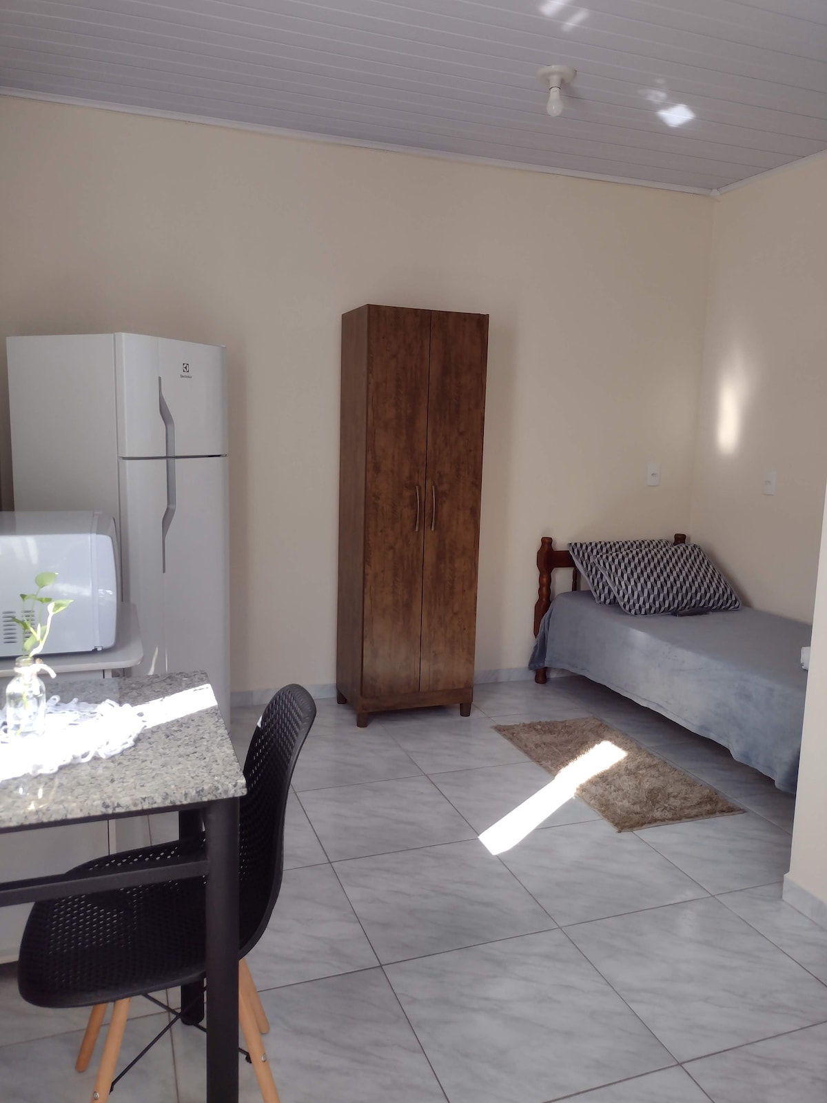 Pequeno apartamento a cerca de 550 metros da praia, com uma cama king size, banheiro completo e área de cozinha com utensílios. São 4 pequenos apartamentos privativos, que ficam no primeiro andar de minha propriedade com acesso por escadas e entrada privativa. Resido no andar térreo, mas os hóspedes terão privacidade (como em um prédio residencial) pois minha casa é completamente separada dos apartamentos. NÃO TEMOS GARAGEM ( os hóspedes podem estacionar na rua em frente ao imóvel)