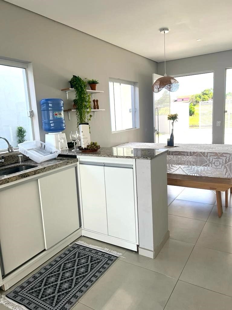 Divirta-se com toda a família neste lugar cheio de estilo. Uma fusão entre natureza e Sofisticação a apenas 150 m do mar situada na Barra, o bairro mais nobre de Itapoá SC... Casa alta, arejada, moderna e novinha! A uma quadra de mercado farmácia peixaria etc Praia com ótima extensão de areia e 2 postos Salva Vidas . Decoração voltada para a natureza, com 2 quartos que saem para uma área de aconchego...um jardim com mesa...banco rede...para tornar o ambiente mais acolhedor.
