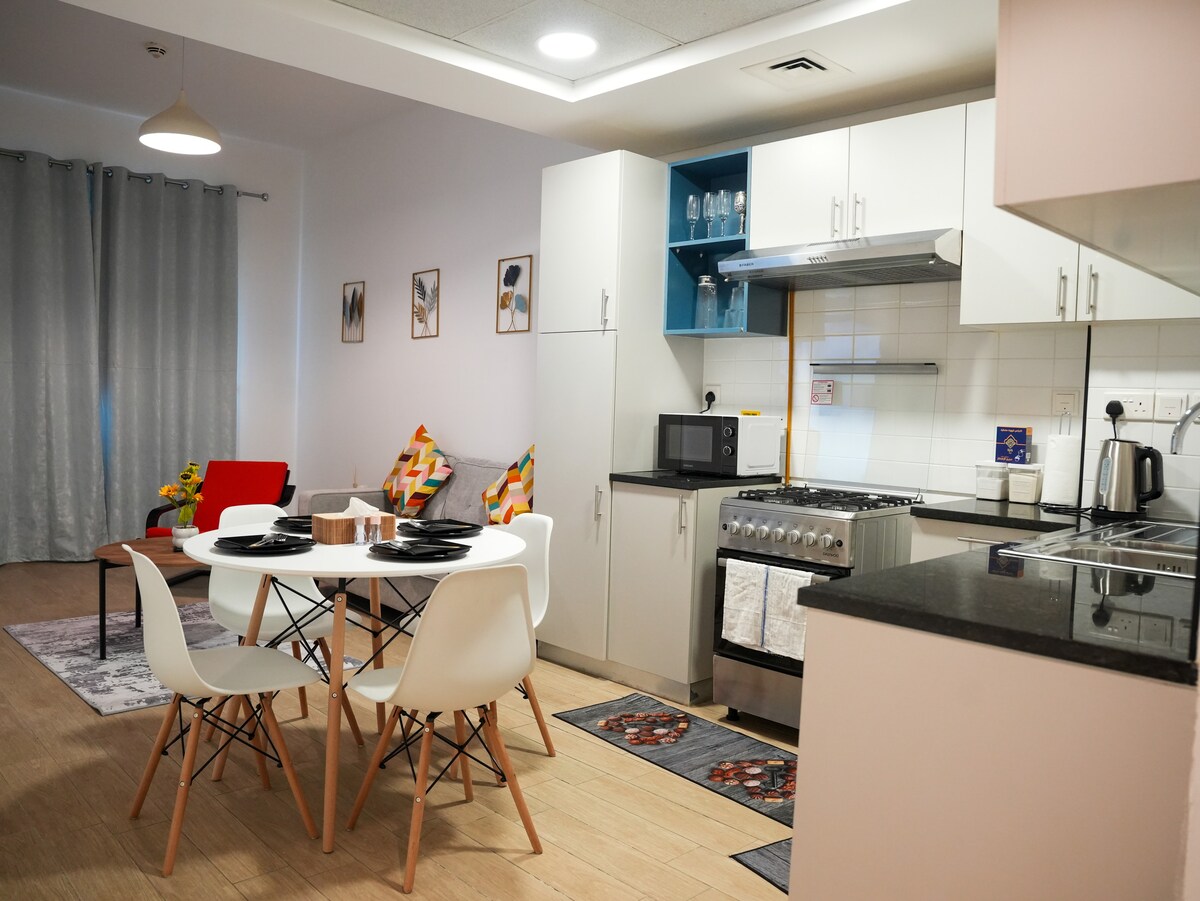 Φωτεινό, κομψό και άνετο, αυτό το πολυτελές στούντιο ευρωπαϊκού στιλ είναι η ιδανική επιλογή σας! Βρίσκεται στο Al Furjan, ιδανικό για εξισορρόπηση εργασίας και αναψυχής. 2 ενήλικες + μωρό Πλήρως εξοπλισμένο για μια άνετη διαμονή. Ηλεκτρικό μηχανικό δίκυκλο διαθέσιμο 17 λεπτά με τα πόδια από το μετρό 10-20 λεπτά από τις εμβληματικές τοποθεσίες του Ντουμπάι: Marina, JBR, Burj Al Arab, Palm Jumeirah, Dubai Eye 8 λεπτά για να βουτήξετε Παροχές στο κτίριο: Σούπερ μάρκετ, φαρμακείο, πισίνα κ.λπ. Ιδανικό για ζευγάρια και επαγγελματίες ταξιδιώτες!