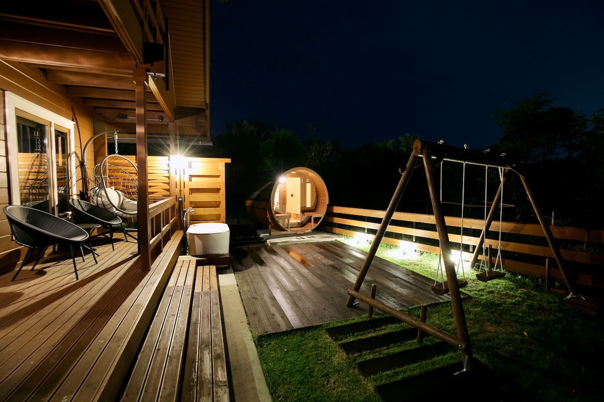 ログハウスで【サウナ・BBQ】 『ニジゲンノモリ』徒歩 5分・橋と観覧車 &神戸の夜景を望む癒しの空間