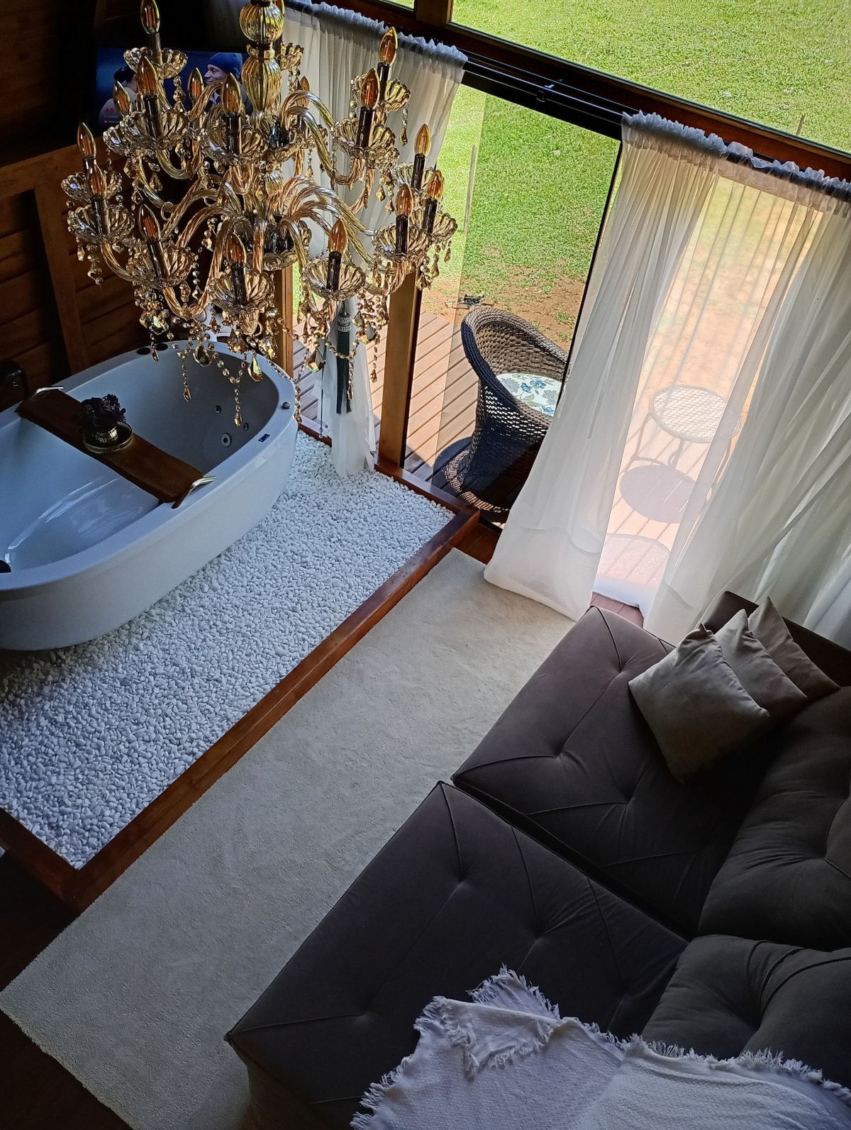 Um chalé acolhedor, com ambiente decorado com bom gosto, que combina conforto e simplicidade, ideal para relaxar. Banheira privativa perfeita para aquele banho demorado com espuma, uma taça de vinho e música suave. Cama confortável e roupa de cama de qualidade, para que o sono seja tão tranquilo quanto o dia começa. Espaços pensados para seu bem-estar: iluminação suave, privacidade e ambiente ideal para casais, ótimo para quem busca um fim de semana romântico ou simplesmente fugir da rotina.