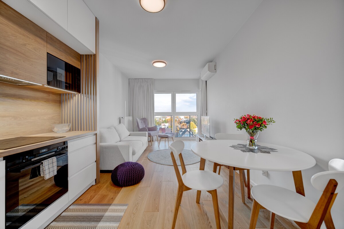 Komfortowy, w pełni wyposażony apartament w nowym budynku. Salon z otwartą kuchnią podzielony na część jadalną i wypoczynkową. W sypialni znajduje się duże łóżko i przestronna szafa. Jest także garderoba jako dodatkowe miejsce do przechowywania. W okolicy znajdują się sklepy, restauracje i kawiarnie Wyposażenie: klimatyzacja, ekspres, czajnik, żelazko, deska do prasowania, pralka Dojazd z Lotniska Chopina 20 min taxi 50 min komunikacja z Lotniska Modlin 50 min taxi 120 min komunikacja