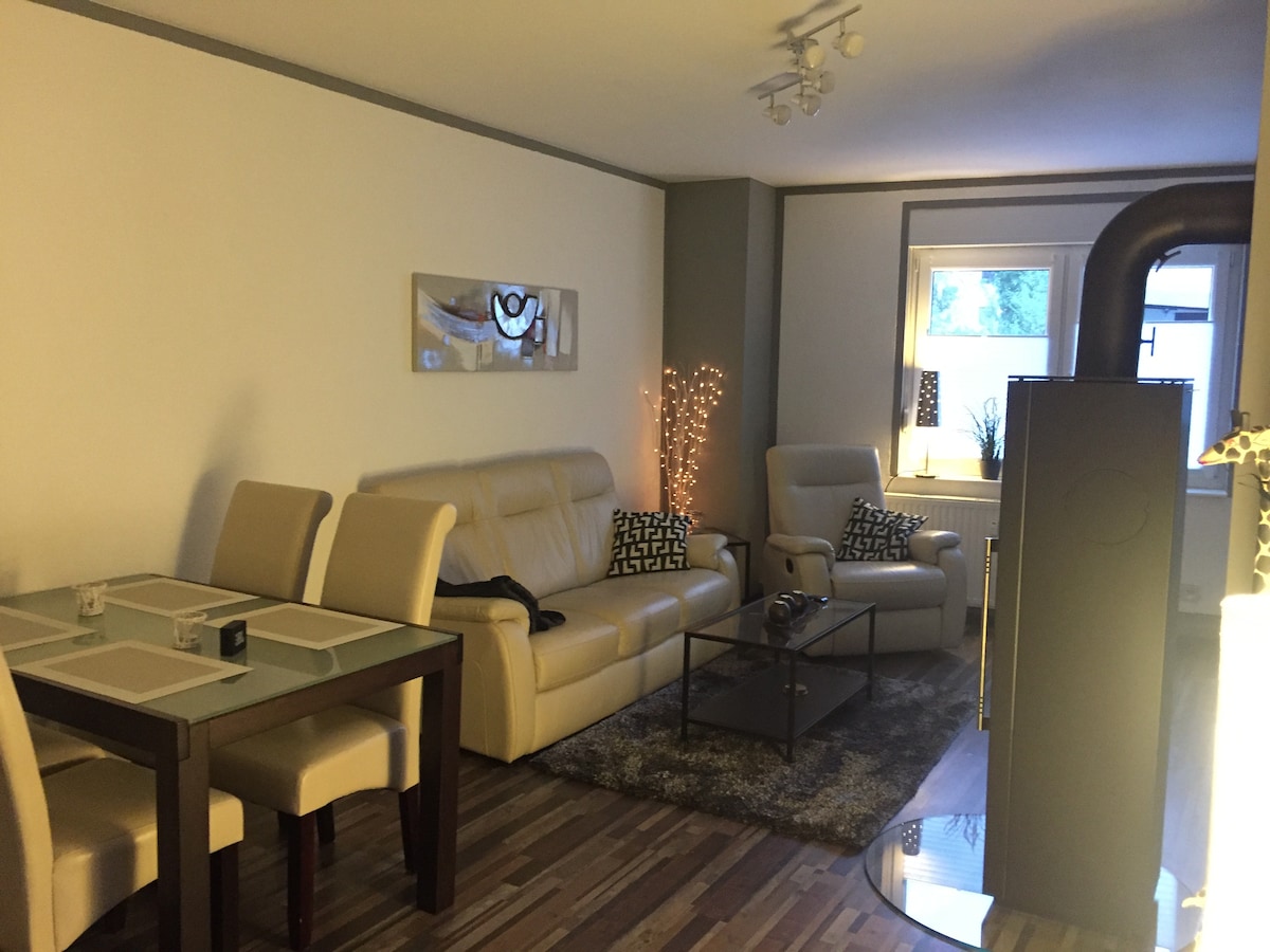 Die Wohnug ist sehr gemütlich eingerichtet. Es können bis zu 4 Pesonen untergebracht werden. Das Schlafzimmer mit Doppelbett und Kleiderschrank. Kinderzimmer mit Bett und Kleiderschrank. Stube mit Fernseher und Schlafcouch. Nutzung des W-Lans ist Kostenlos. Im Flur steht ein zusätzlicher Schrank. Im Bad befindet sich eine Wanne. Die Küche ist sehr gut ausgestattet. In der Nähe von IFA, Hermes, Euroglas, Banhof, Busbahnhof, Einkaufsmöglichkeiten. - Nichtraucher - keine Kinder unter 12