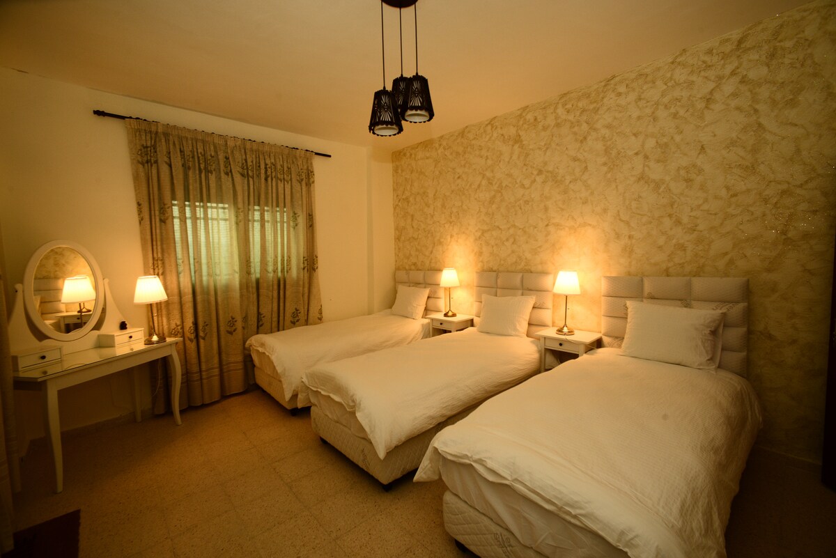 Spacious apartment located in a quiet, residential location with a beautiful view of a valley with olive tree terraces. It is at immediate walking distance to a supermarket and a bus stop, with connections to Bethlehem (10 min driving) and Jerusalem center (30 min driving). Restaurants are nearby. The apartment is equipped with appliances, WiFi, private entrance, and free public parking right in front of the house. It is suitable for couples, lone adventurers, business travelers, and families.