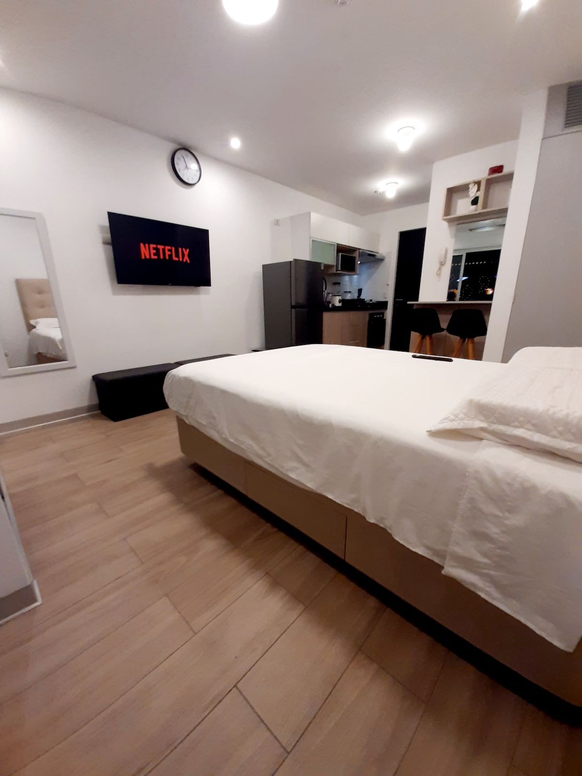 Disfruta de un departamento privado y moderno, ideal para relajarse o trabajar. La amplia habitación principal ofrece una cama de dos plazas, TV Smart QLED de 55”, baño privado y un cómodo escritorio. Cocina totalmente equipada, sala y comedor privados para disfrutar momentos agradables. Ubicado en una zona tranquila, a pocos minutos de Real Plaza. Reserva de 1 habitación. La segunda habitación y baño no están incluidos y permanecen cerrados. Departamento de uso exclusivo (no compartido).