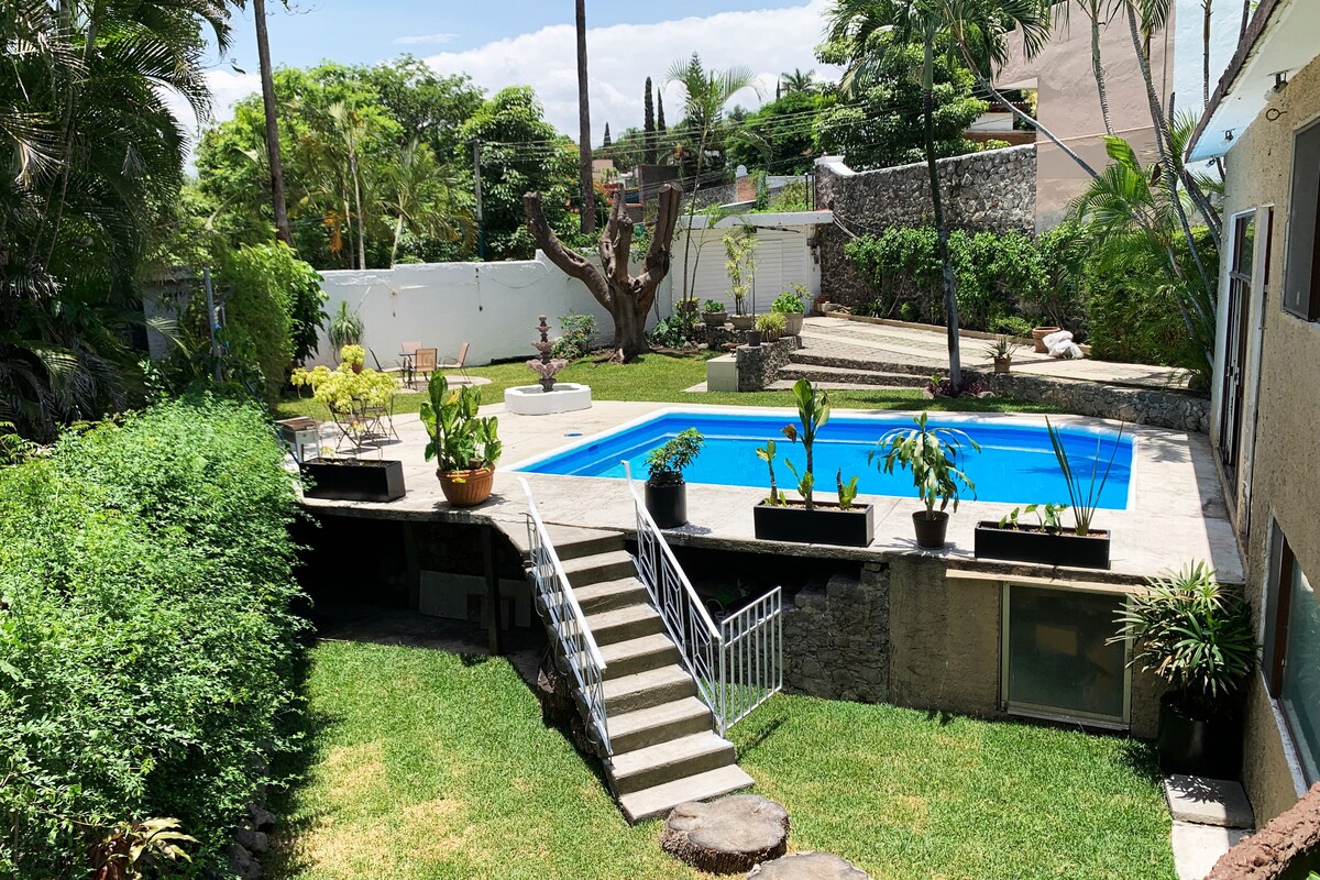 Ο χώρος μου βρίσκεται σε ΕΞΑΙΡΕΤΙΚΉ τοποθεσία 2 λεπτά μακριά από το Hacienda de Cortés Hotel, 8 λεπτά από το Jardín Huayacán, την περιοχή του γάμου και 10 λεπτά από το κέντρο της Κουερναβάκα. 2 υπνοδωμάτια με διπλό κρεβάτι σε κάθε υπνοδωμάτιο, δύο μπάνια, καθαρές πετσέτες και τα απαραίτητα για το μπάνιο, πισίνα, μεγάλη βεράντα, με μπάρμπεκιου και πολυθρόνες, εξαιρετικά γρήγορο ίντερνετ. Πλήρης κουζίνα με δωρεάν καφέ/τσάι, υποστήριξη 24 ώρες το 24-ωρο μέσω κειμένου, email ή τηλεφώνου, στάθμευσης, κάμερα ασφαλείας για εξωτερικό χώρο και κατοικίδια ευπρόσδεκτα! Η μέγιστη χωρητικότητα 5.