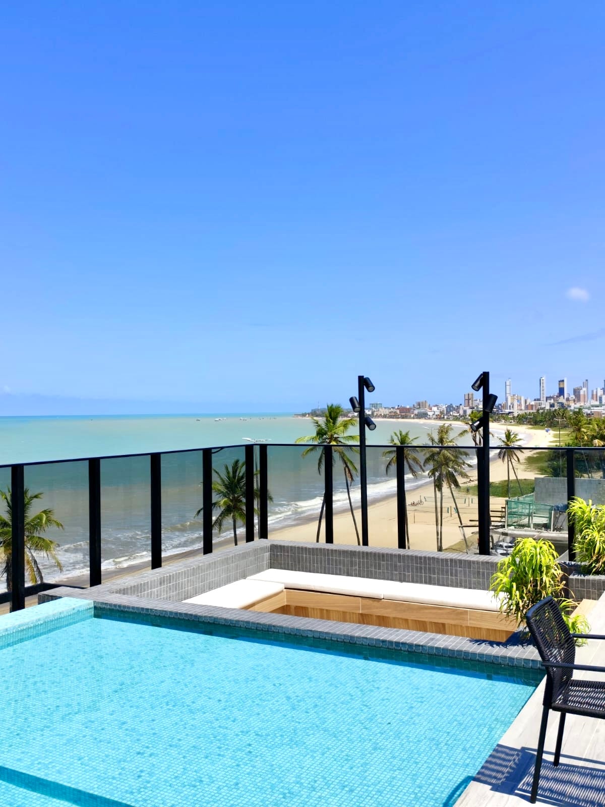 Flat novo a 50m da melhor orla da cidade, no Cabo Branco, cama queen size, ar condicionado, louça, smartTV, frigobar, sanduicheira e cafeteira nespresso, no andar 2, com elevador ou apenas um lance de escadas. Na cobertura, há piscina com borda infinita e jacuzzi aquecida, ambas com vista para o mar. O prédio oferece co-working, Wi-Fi, academia, recepção 24h e vaga de garagem rotativa. Coffee shop com opção de café da manhã com buffet livre das 6:30am às 10am no valor de R$30 por pessoa