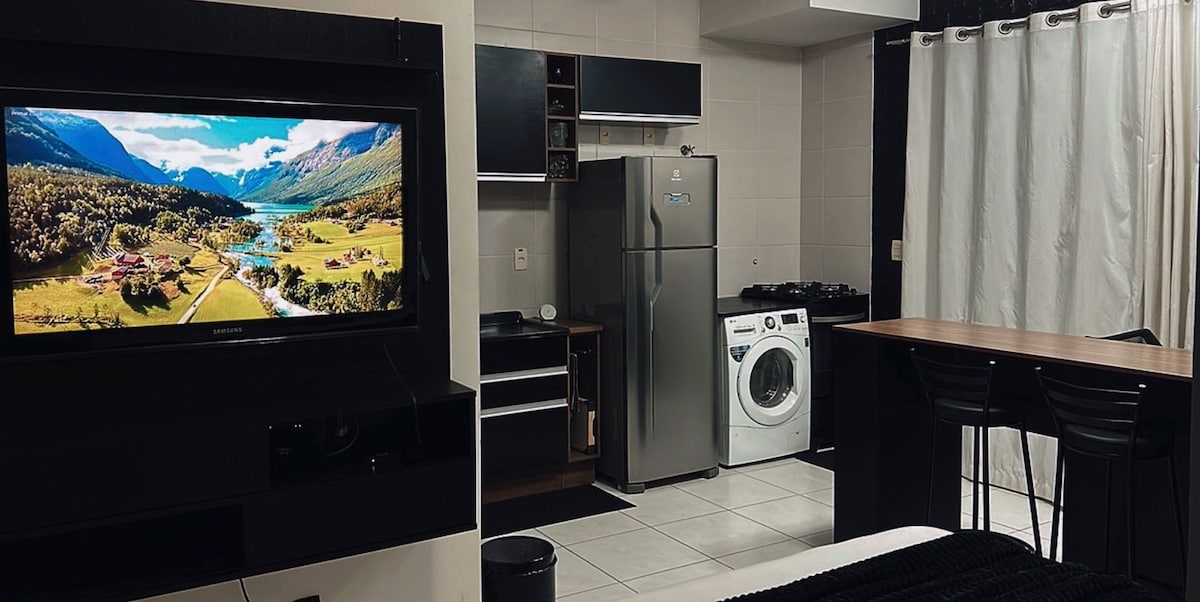 Estiloso Studio temático "Tropical Forest"! Εξαιρετικά εκλεπτυσμένο, άνετο και πολυτελές, ιδανικό για άτομα με στιλ που αναζητούν άνεση και πρακτικότητα. Benvenutti Line Queen Bed, super comfortable. Τηλεόραση Smart 43" με ροή. Ισχυρό Wi-fi. Πλήρης κουζίνα εξοπλισμένη με κατσαρόλες και σκεύη Tramontina, πιάτα Porto Brasil, ποτήρια και ποτήρια κρασιού. Καφετιέρα και μπλέντερ. Παρέχουμε καφέ σε σκόνη, ζάχαρη και αλάτι, καθώς και σαπούνι και σαμπουάν. Θα παρέχονται επίσης καθαριστικά προϊόντα.