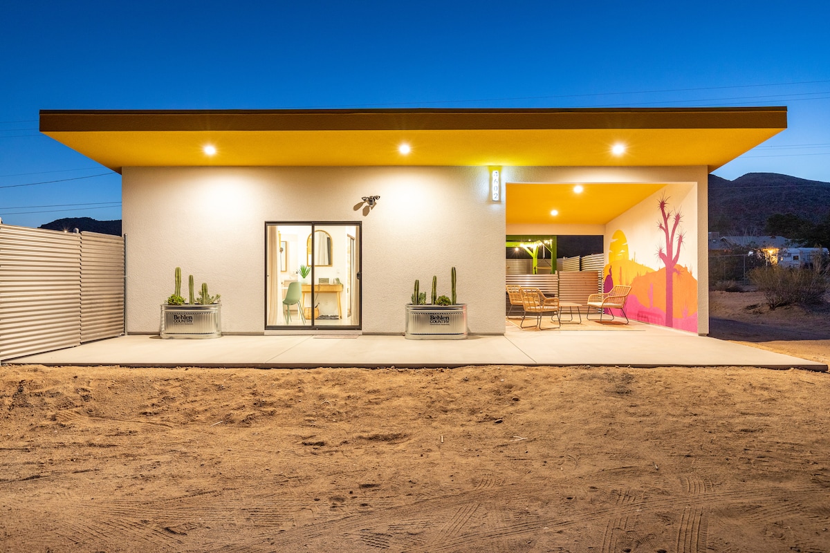 Escape to total seclusion at The Glow House - our remote desert oasis where you can unwind and disconnect on 5 private acres, just 20 minutes from Joshua Tree National Park. We've created this space with the intention for you to immerse yourself in total relaxation. Slow mornings, the fresh air of nature, soaking in our rooftop tub as the sun sets, and getting cozy by the fire under the stars.