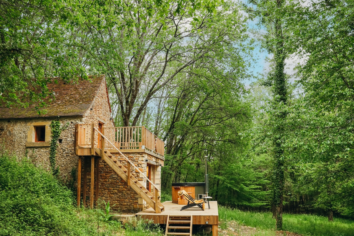 Lieu idyllique pour séjourner en Dordogne à deux ! Une chambre double avec sa salle de bain (accès par une échelle). Une cuisine vue sur la nature. Un jacuzzi extérieur de quoi se détendre en pleine nature ! Vous bénéficierez d’un petit véhicule qui vous permettra de faire le trajet depuis le parking jusqu’au logement (le tout en terrain privé). La location de ce véhicule est incluse dans le prix.