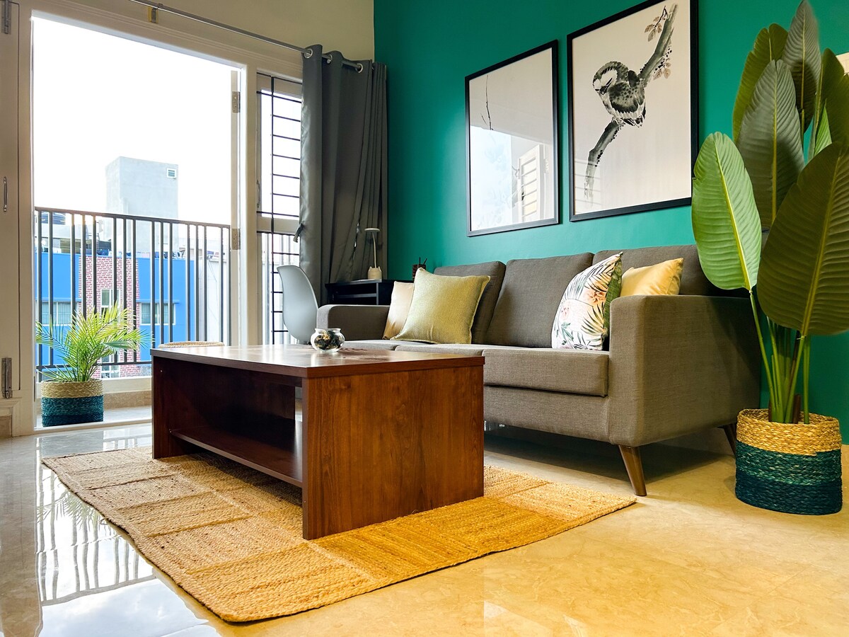 Θα θέλαμε πολύ να σας φιλοξενήσουμε στο 1 BHK (EARTHY Homestay) που συνδυάζει το στυλ με μια γήινη, γαλήνια ατμόσφαιρα και ασυναγώνιστα πανοράματα. - Μπαλκόνι Oasis: Θέα στο δάσος + κινηματογραφικά ηλιοβασιλέματα στα 200 μ. - Κορυφαία τοποθεσία: 2 λεπτά από το NIFT και 3 λεπτά από τις καφετέριες, τις μπουτίκ και το street-food της 27ης Main - Γαλήνιοι εσωτερικοί χώροι: Μεγάλο διπλό κρεβάτι, ατμοσφαιρικός φωτισμός και πλούσια ζωντανά φυτά - Εργασία και ψυχαγωγία: Wi-Fi υψηλής ταχύτητας, μεγάλη τηλεόραση και καθαρός αέρας Απολαύστε στιλ, γαλήνη και θεαματικά ηλιοβασιλέματα σε ένα άνετο καταφύγιο! - 5ος όροφος (χωρίς ανελκυστήρα)