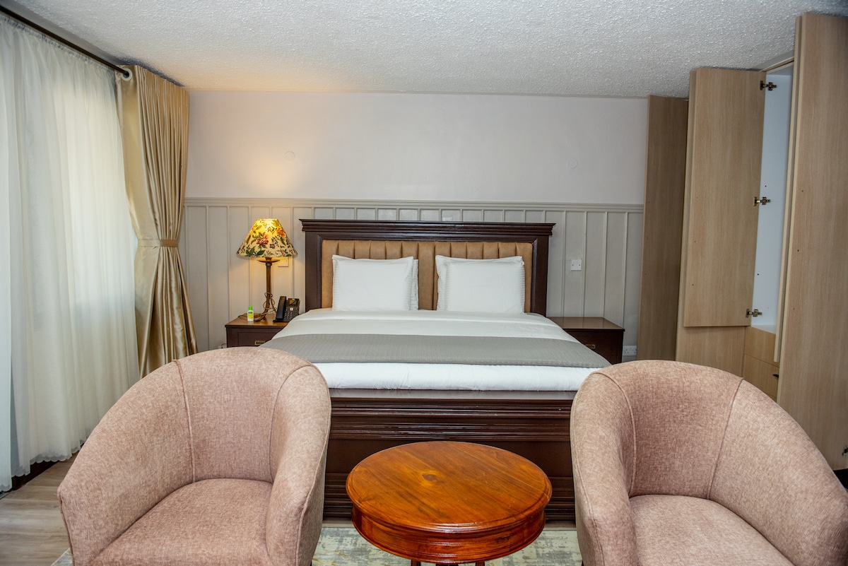 Indulge in our spacious King Suite at Light Villas Gigiri. Featuring modern décor, a plush king-size bed, and a dedicated work area. Enjoy natural light and city views. Amenities include high-speed Wi-Fi, smart TV, and an en-suite bathroom with premium toiletries. Access our gym, sauna, steam room, jacuzzi, and conference facilities. Located in Nairobi's prestigious Gigiri district, near the United Nations Office and Village Market.