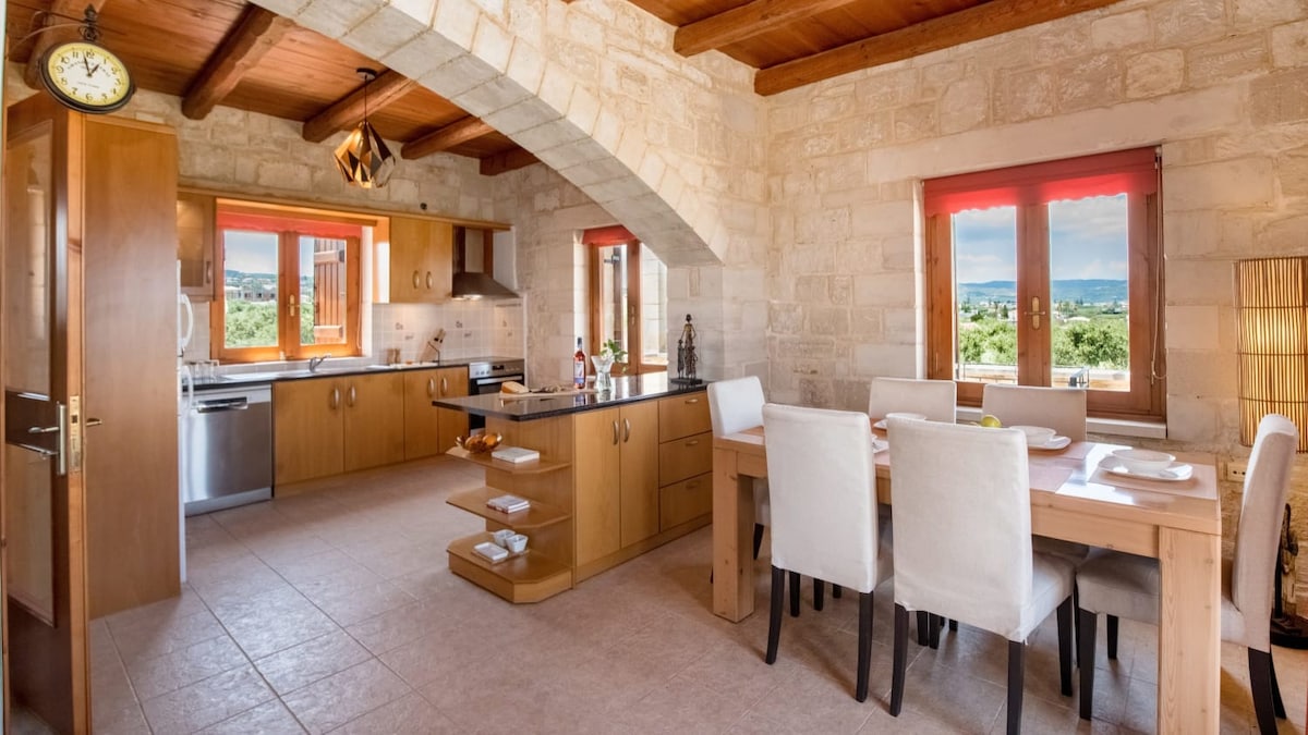 Μέσα σε ελαιώνες κ μόλις 3' από την παραλία, αυτή η μοντέρνα διώροφη πέτρινη βίλα κρητικής αρχιτεκτονικής είναι ιδανική για διακοπές.Φιλοξενεί έως 7 επισκέπτες. Η ανατολή του ηλίου, ο ήχος των κυμάτων και η υπέροχη θέα στη θάλασσα κ το βουνό προσθέτουν γοητεία. Διαθέτει μεγάλο κήπο, πισίνα και καλλιτεχνική διακόσμηση με διεθνή στοιχεία,όπως τοίχο αφιερωμένο στη μουσική και συντριβάνι. Με χώρους για γιόγκα και παιχνίδια, η βίλα απέχει 22 χλμ.από το κέντρο των Χανίων,προσφέροντας ιδανική απόδραση.