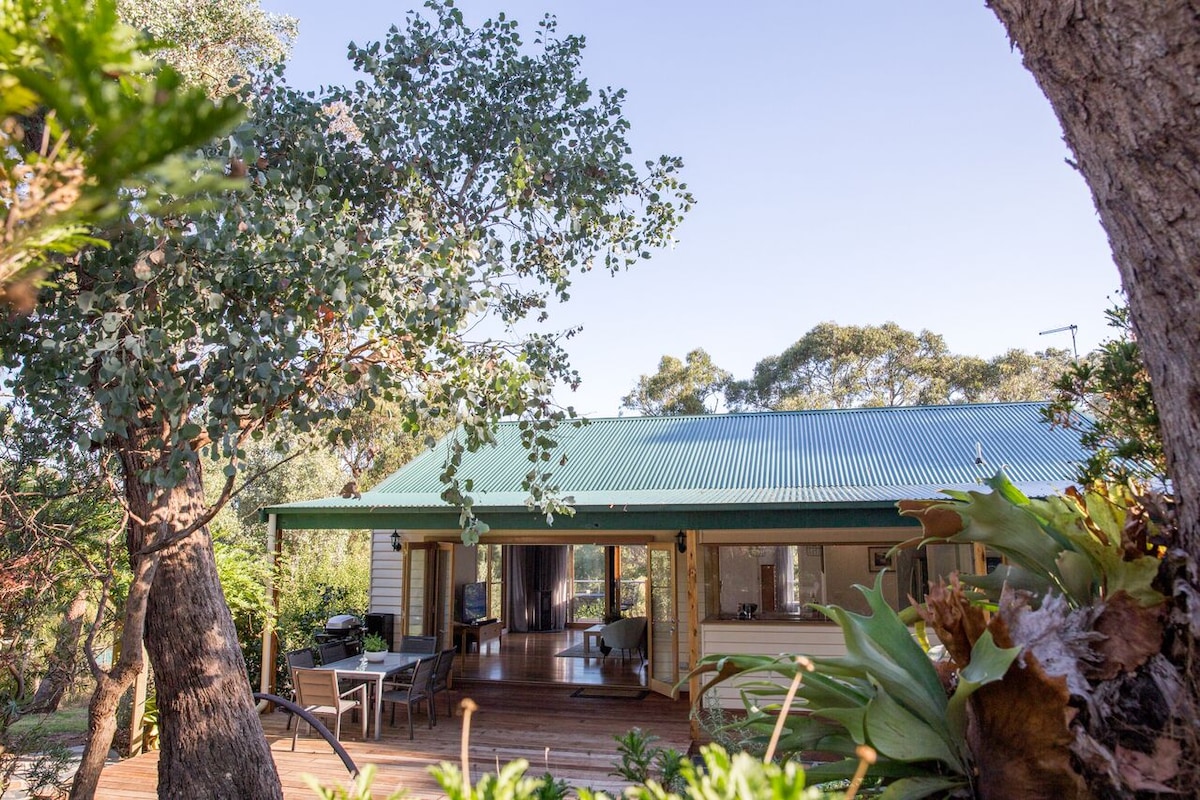 Dandaloo Luxury Escape is a self-contained 2-bedroom house set in the grounds of Dandaloo homestead, circa 1890s. It has been tastefully renovated and built to take in the ambiance of surrounding gardens and natural bush. Each morning of your stay you can begin the day by enjoying a leisurely breakfast on one of the 3 decks, using the quality provisions left for you in the fridge. Later you can relax in the outdoor bath on the back deck and maybe see kangaroos or king parrots.