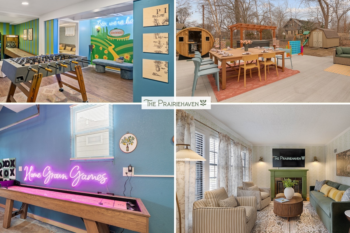 Καλωσορίσατε στο The Prairiehaven. Το μοναδικό κατάλυμά μας φιλοξενεί έως 16 επισκέπτες και είναι γεμάτο με διασκεδαστικές παροχές σε στιλ θέρετρου για όλες τις ηλικίες: 🕹️ Ηλεκτρονικά 🍿 Δωμάτιο προβολής ταινιών 🍬 Μπάρα σνακ 🤳 Τοίχος για selfie/φωτογραφίες 🎱 Μπιλιάρδο 🎲 Δωμάτιο παιχνιδιών 🏀 Καλάθι μπάσκετ ♨️ Τζακούζι 🧖 Σάουνα 🔥 Εστία φωτιάς 📽️ Προβολέας ταινιών εξωτερικού χώρου 🧒 Παιδική χαρά 📚 Γωνιά ανάγνωσης 😊 Κατάλληλο για οικογένειες (καρεκλάκι φαγητού, παιχνίδια και είδη ψυχαγωγίας) 📍 Κεντρική τοποθεσία (αεροδρόμιο, αθλητικές εγκαταστάσεις, εστιατόρια, πάρκα, καταστήματα)