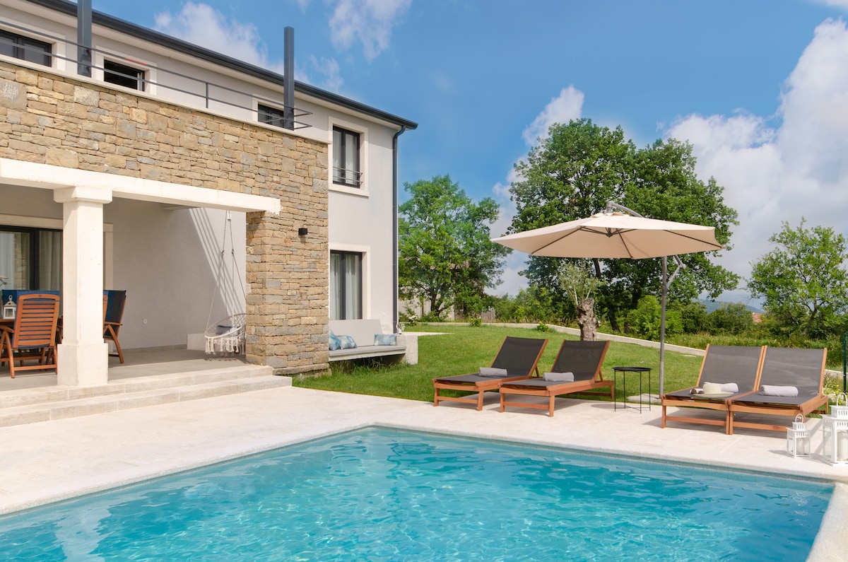 Stylish villa near Rovinj with picture worthy pool, sunk in hot tub, sauna. Wake up to lush, panoramic valley views. Couples and family-friendly, a short drive to adventure park, Brijuni National Park, dinopark, medieval towns & local cuisine. It is a true green escape for anyone looking to get back to nature with all the comfort of modern living. Fully equipped for cooking and entertainment in 2600 m2 of garden (football, speed ball, badminton & pool fun) for your kids and loved ones to enjoy.