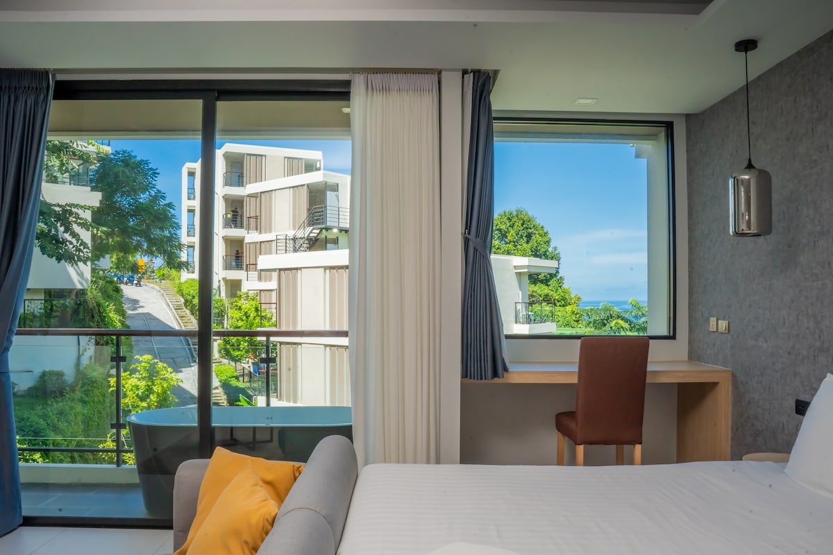 Πλήρως αυτόνομο στούντιο με θέα στον ωκεανό και πλήρως εξοπλισμένη κουζίνα. Εσείς αποφασίζετε αν είναι η πισίνα στον τελευταίο όροφο με εκπληκτική θέα στη θάλασσα ή η ιδιωτικότητα του δικού σας μπαλκονιού με θέα στη θάλασσα που περνάτε τον χρόνο σας. Το μπαλκόνι είναι το ιδανικό μέρος για να απολαύσετε το πρωινό σας και το καλύτερο σημείο για να απολαύσετε τα υπέροχα ηλιοβασιλέματα του Πουκέτ. Υπάρχει επίσης μια πισίνα στο ισόγειο που είναι στη σκιά για το μεγαλύτερο μέρος της ημέρας. Βρίσκεται στο διάσημο τμήμα του Karon στους πρόποδες του τροπικού δάσους με θέα στον ωκεανό.