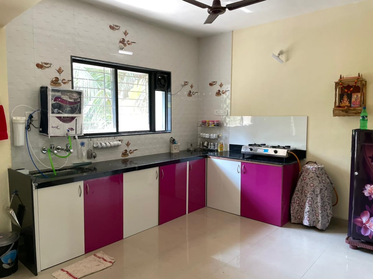 * Families preferred. No smoking or drinking. * Escape to our cozy homestay in Shrivardhan, just a few minutes from the beach. The space is most comfortable for 4 guests due to a single bathroom, but we can accommodate up to 5 adults. Enjoy air-conditioning, inverter backup, TV and Wi-Fi for a comfortable and convenient stay. While we don’t offer food or silverware, there are several restaurants located just 5-10 minutes away, as well as nearby options offering homemade-style food.
