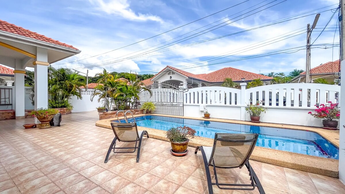 Ένα νέο, ρομαντικό, άνετο, καθαρό και ασφαλές σπίτι, φιλικό προς την οικογένεια και το γραφείο. Μεγάλο τζακούζι για 6 άτομα!! Πολύ βολικό, πλήρες κλιματιστικό, καλά στρώματα, αρκετές σκιερές βεράντες, μπάρμπεκιου, πλυντήριο ρούχων, ζεστό νερό, Netflix ... Βρίσκεται σε ένα χαλαρωτικό και ήσυχο χωριό, μόλις 5 έως 10 λεπτά από … - κέντρο πόλης - όμορφες παραλίες - εμπορικά κέντρα - τουριστικά αξιοθέατα - νοσοκομεία Επίσης, ελέγξτε τα άλλα εξοχικά σπίτια 5 αστέρων: airbnb.com/h/huahincityloft ... και: airbnb.com/h/city88home.