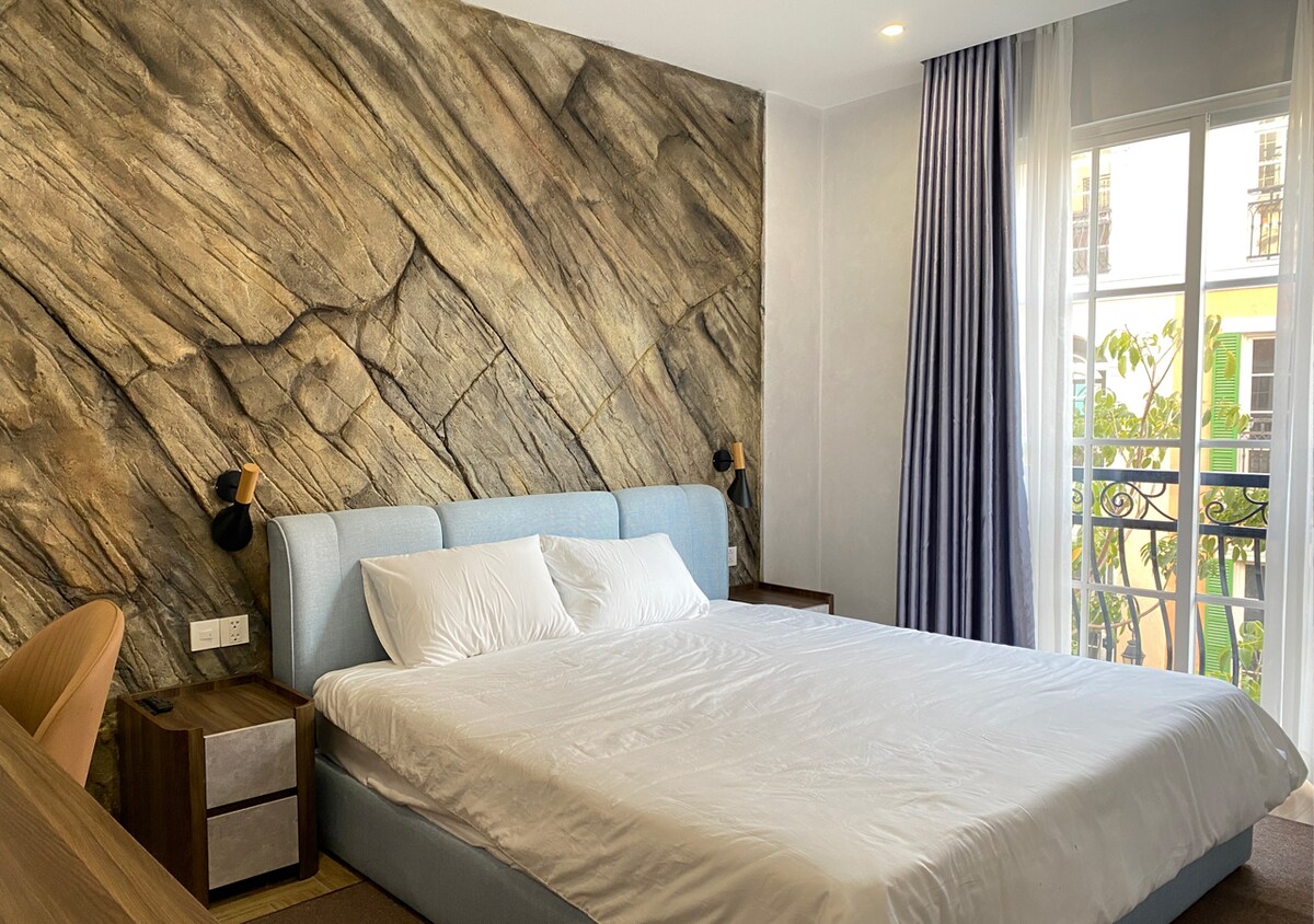 Mey Mansion PQuoc_Μοντέρνο δωμάτιο με μεγάλο διπλό κρεβάτι και θέα στην πόλη