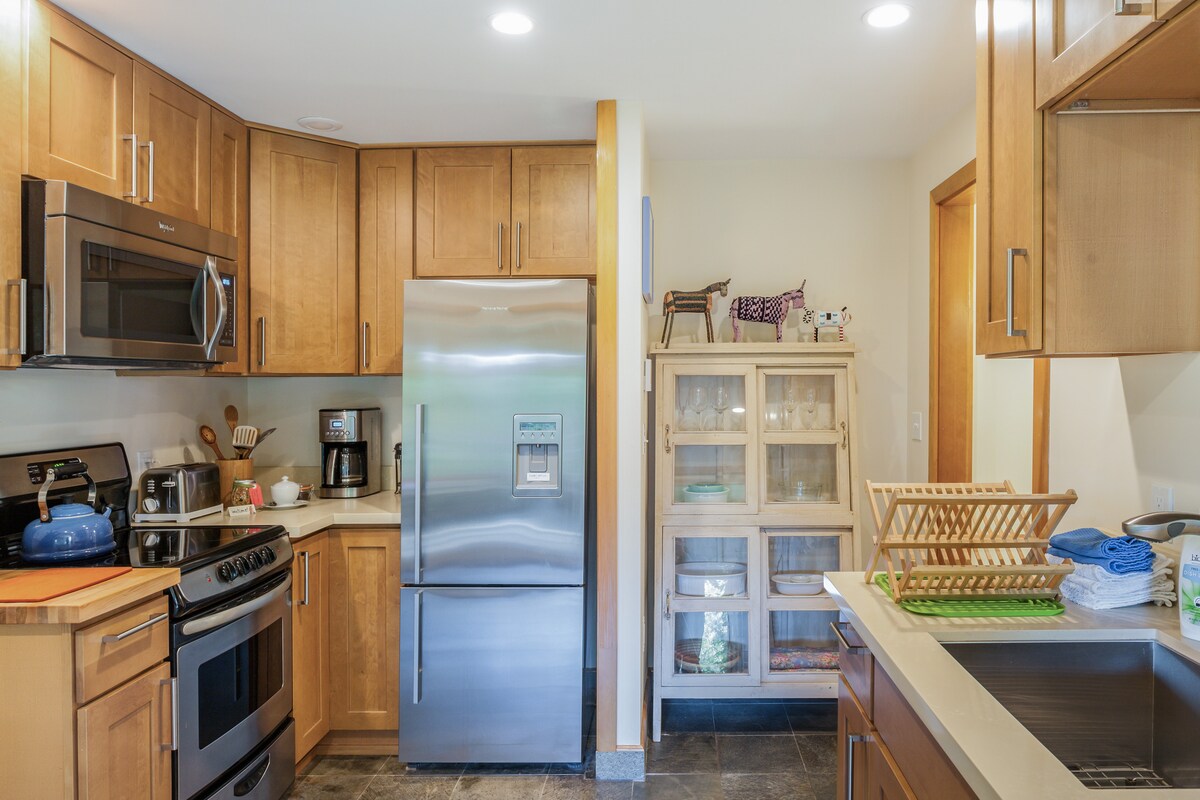 Wake up from a blissful night’s sleep and step out for a morning walk in the fresh air and woodsy garden before breakfast. This secluded guest suite charms with its comfy furnishings, a full kitchen, and big glass doors opening to lush green spaces. Comfortable and modern, our walk-out level space features a bedroom with a dreamy bed, all natural bedding and walk-in closet. Natural light filters into every room. There are two outdoor patios offering space to lounge, dine and enjoy views of the Olympic Mountains, our gardens, and orchard. The bathroom has elegant limestone fossil tilework, and the kitchen/dining area is new and designed by cooks, for cooks. There is no indoor 'living room'. There is one (1) dedicated parking space and private access to your space by a path and steps (not handicapped accessible, sorry!) We have a cart for carrying luggage and are happy to assist. Sitting area in the orchard for sunset viewing and fresh vegetables from our seasonal organic garden may be available. A short walk connects you to community trails and a stroll through a neighboring vineyard (wine tastings too!). We're close to Rollingbay, parks, and yoga classes: mid-island gives you easy access to everything! We live in the main part of the house and love to share our home and island. We'll meet you upon arrival, and are available as needed during your stay. We respect your privacy. We have provided maps and notes of local places to see or enjoy. Hike and bike the trails just outside the door. Fay Bainbridge Park, Bloedel Reserve, and Bay Hay—a local icon with coffee, gifts, and locally sourced groceries—are all nearby. Downtown Winslow and the Seattle-Bainbridge ferry are 10 minutes away. Just ten minutes from the Seattle ferry, car rentals, taxis and buses are available from the ferry station. Depending upon your arrival time, we can assist with information. Driving is simple - it's easy to find. Kitchen has the basics like spices, coffee, and home-made granola for your first morning. Laundry facilities are available upon arrangement. Also, during gardening season we close our driveway gate at day's end for the night to discourage munching deer. It's not locked. If you find the gate closed, just push it open, pass through and kindly re-close it. Thanks!