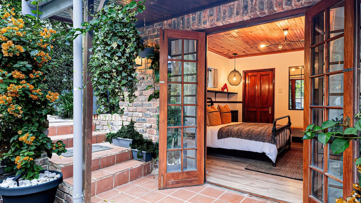 Tucked away in tranquil private garden, this charming hideaway invites you to slow down and unwind. Sink into a queen-size bed dressed in crisp white linen, enjoy the comfort of an en-suite shower, make yourself at home with a cozy kitchenette featuring a microwave, bar fridge, and Nespresso coffee machine. Fast Wi-Fi, peaceful surroundings, and a romantic atmosphere await. A hot tub is available on request at R500 per session, and the sauna at R150 per person — perfect for relaxing together.