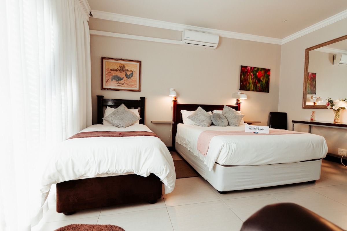 Ζήστε ένα ήσυχο και γραφικό ολονύκτιο καταφύγιο στο Klerksdorp μέσα στην ιδιωτική σουίτα επισκεπτών μας. Αυτός ο άνετος χώρος διαθέτει ένα διπλό κρεβάτι, κλιματισμό, μίνι ψυγείο, βραστήρα, φούρνο μικροκυμάτων, γραφείο, τηλεόραση, ανεμιστήρα και ιδιωτικό μπάνιο. Επιπλέον, ένα μπράι μπορεί να κανονιστεί κατόπιν αιτήματος. Φωλιασμένο ξεχωριστά από την κύρια κατοικία μας, εξασφαλίζοντας απόλυτη ιδιωτικότητα. Βολικά κοντά σε μεγάλα σχολεία και νοσοκομεία. Πλήρης πρόσβαση σε φράγμα, ποτάμι και πισίνα. Ιδανικό για καλεσμένους γάμου ή επαγγελματικά ταξίδια.