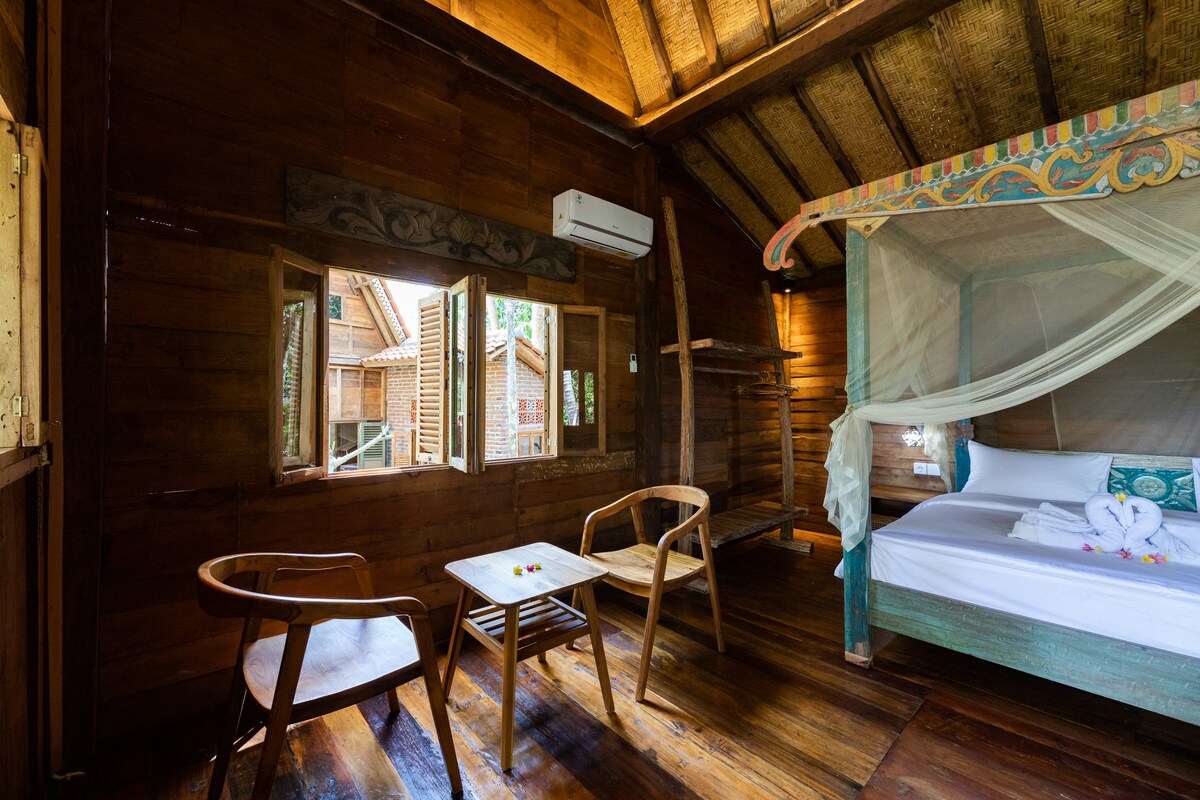 Παραδοσιακό μπανγκαλόου του Μπαλί από ξύλο, διακοσμημένο με γούστο. Το δωμάτιο των 25 τ.μ. έχει ένα πολύ άνετο κρεβάτι 180 x 200, γραφείο και μεγάλη ντουλάπα. Το διπλανό μπάνιο περιλαμβάνει ένα μεγάλο ντους με ζεστό νερό, ένα wc και έναν μεγάλο νεροχύτη με καθρέφτη. Περιλαμβάνεται πρωινό, θα σερβίρεται κάθε πρωί, μεταξύ 8 π.μ. και 11 π.μ. σύμφωνα με τις επιθυμίες σας. Θα έχετε την επιλογή ανάμεσα σε ψωμί, τηγανίτες vegan, αυγά ή ένα μπολ με smoothie, όλα σπιτικά και νόστιμα:-)