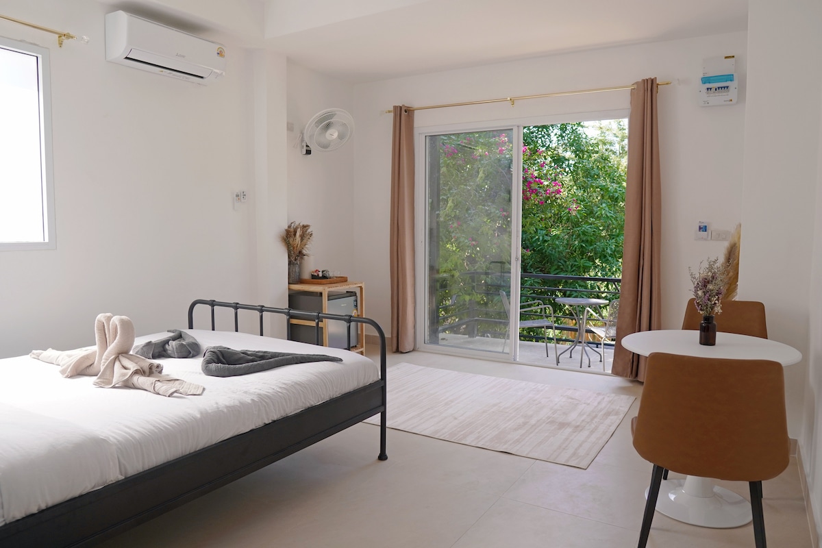 Το δωμάτιο Garden View είναι η ιδανική επιλογή για 2-3 φίλους που αναζητούν ισορροπία μεταξύ άνεσης και οικονομίας, ενώ απολαμβάνουν την ομορφιά του Koh Phangan. Αυτό το ευρύχωρο, κλιματιζόμενο δωμάτιο διαθέτει ένα διπλό κρεβάτι και ένα μονό κρεβάτι. Φωλιασμένο σε έναν ήσυχο ιδιωτικό δρόμο, το θέρετρό μας προσφέρει μια ήρεμη απόδραση μόλις 5 λεπτά με τα πόδια από την πολυσύχναστη καρδιά του Haad Rin. Ανακαλύψτε κοντινά εστιατόρια, καταστήματα και την κεντρική παραλία, διάσημη για το πάρτι της πανσελήνου.